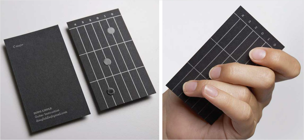 与此列表中的其他示例一样,此吉他指令名片通过提醒潜在客户提供的服务或产品,充分利用了分配的小空间。在这种情况下,使用不同和弦形式的UV斑点(闪亮的层)是一个巧妙的例子,可以作为你自己聪明的想法的灵感。
