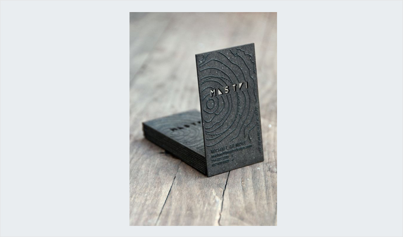 借助替代材料是另一种脱颖而出的绝佳方式。只需看看这张定制厚纸上印刷的垂直卡片。这款独特的名片采用激光蚀刻定制浮雕设计,带有切口,几乎看起来像一块薄薄的岩石。