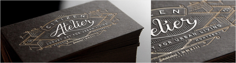 如果你正在寻找一种特别精致的设计,这款专业制作的浮雕和金箔名片是独一无二的。黑色背景上的金色与浮雕中突出的元素相结合,营造出持久的印象。