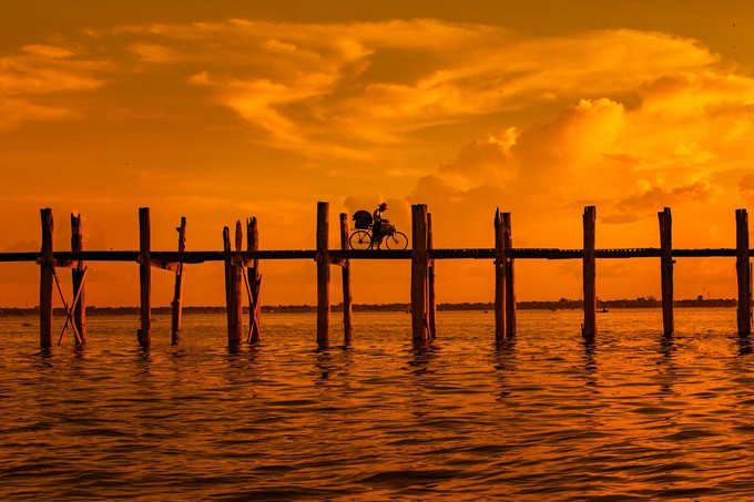 5、乌本桥:见证不朽之桥的唯美日落,乌本桥(U Bein's Bridge),建于1851年,长达1200米,由1086根实心柚木建造而成,是世界上最长的柚木桥,到乌本桥参观游览的最佳时间是黄昏时分,这里是观赏落日的最佳地点。