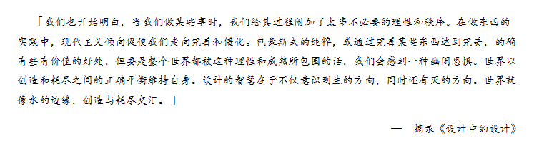 在这之前,我本以为它是一本满满的“干”货,会使我收获很多在设计领域实际运用中的技巧及逻辑经验;读完才领悟到它是点醒你突破“思维禁锢”的一本书,无论如何,这本书讲的绝不单单是设计,随着一页一页的翻阅,就像跟着走完了一条宽广又静谧的长河,所带来的启发和思考是需要静下来去细细品味的...