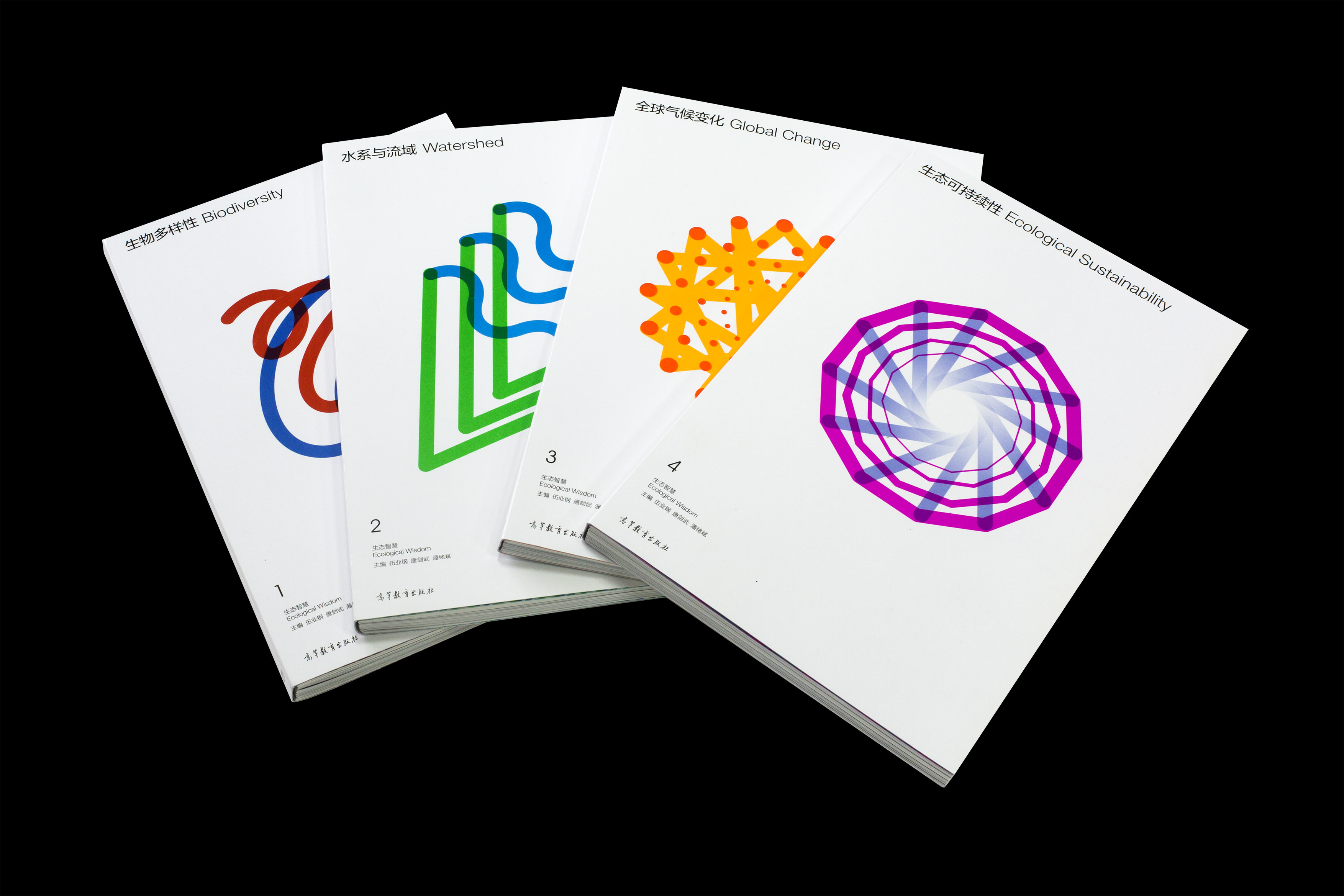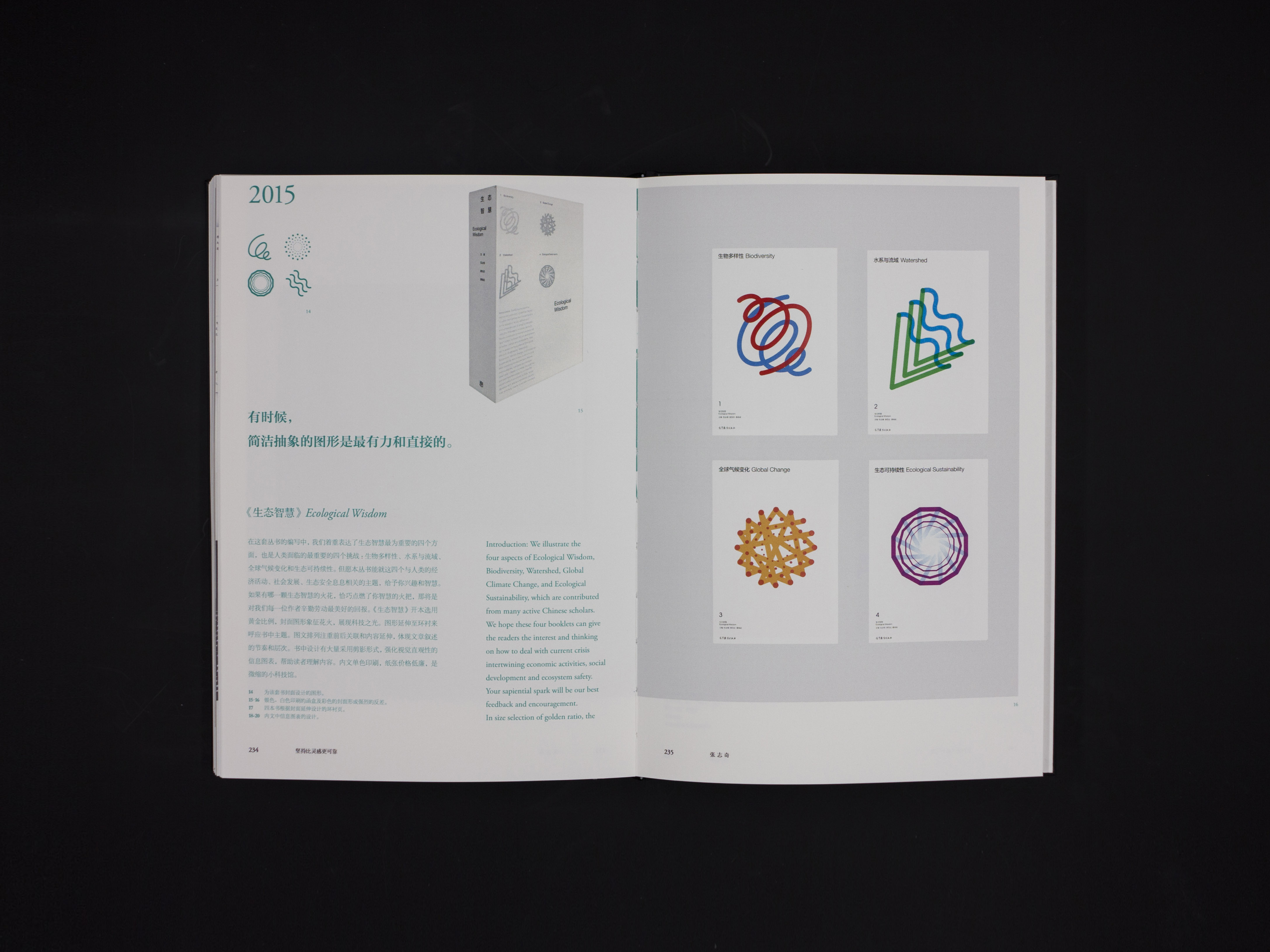 张志奇:《生态智慧丛书》这套小型的科普丛书主要是从4个方面研究环境保护的,书中有大量的图片和信息图表。书的宗旨是展现科技之光,它就像一个微缩的科技馆。拿到设计任务,我的第一想法是采用烟花绽放的画面做设计理念,封面受到烟花的启发,但又如何把抽象概念具象的表现出来呢?这其实是对想象力和绘画能力的考验。于是我在封面设计上就下了比较大的功夫,把抽象的意向化表达运用于封面设计中,如第二本《山川和水系》封面的设计中绿色线条表现山脉的形状,蓝色线条代表山在水中的倒影,图形的组合则表达了二者之间的关系和这本书的主题。
