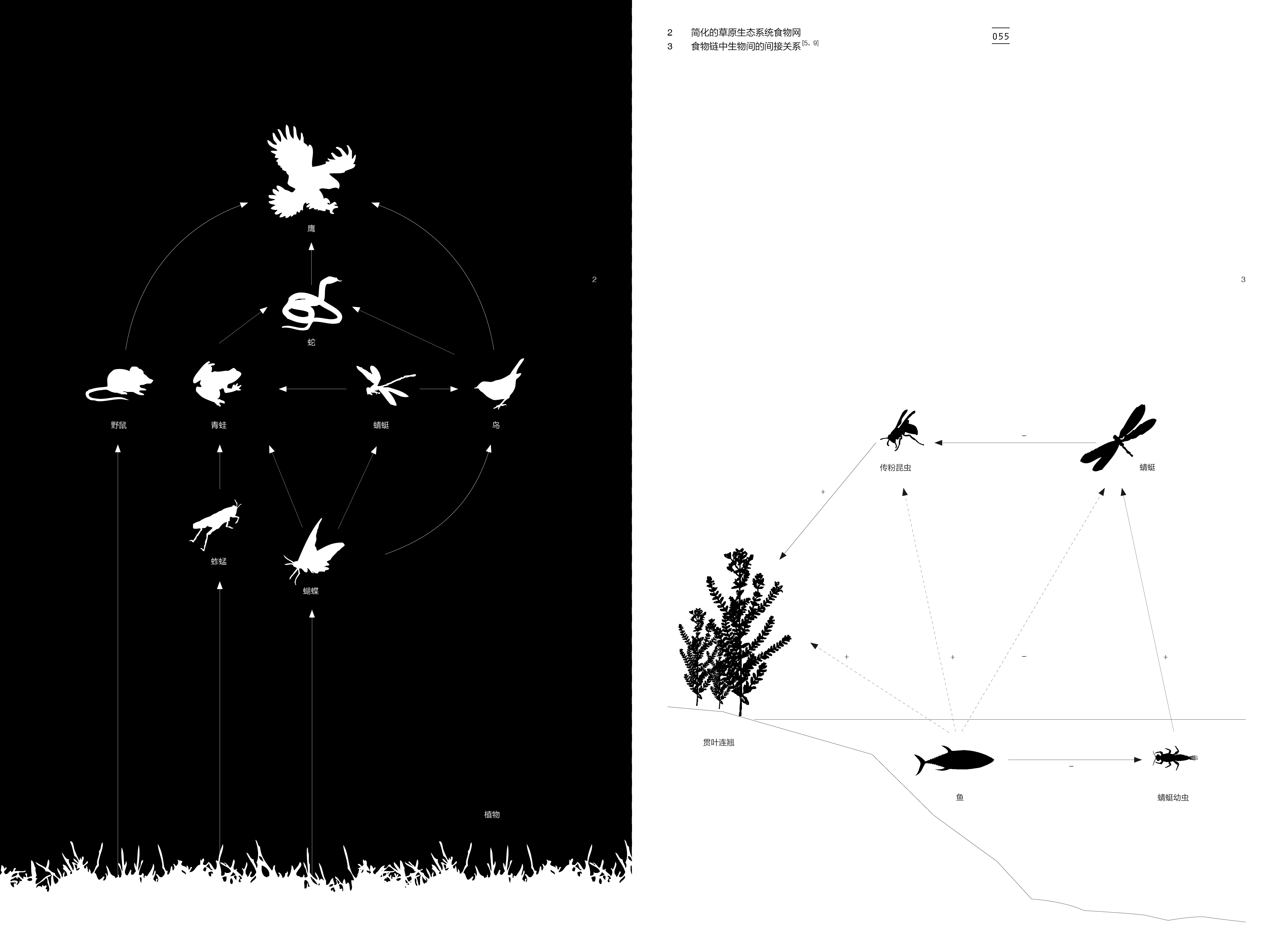 除此外,我还做了一些巧妙的设计,比如,封面图形向外衍生就形成了环衬页,提升轻松的氛围,拉近与读者的距离。内文选用微涂的纸张黑色印刷,页面适当的留白,为思考预留了空间。不过,这本书最难之处还是在信息图表的设计与绘制,作者提供的原图来源不清且绘制粗糙,毫无美感,这些都大大削弱了内容的科学性。为此,我花了大量的时间来重新绘制近百幅信息图表,其中包含了图示、图例、地图等多种信息需要选择不同的呈现方式。与此同时伴随着同一语境下视觉统一的难度、图表中线段粗细的统一,字体字号的一致性等等问题。系列丛书的设计关键就在于要考虑彼此的关联和统一。信息图表作为主角演绎了这套科普丛书,既是主角又是陪衬,同一页面中增加了阅读信息的密度和趣味性,成为文字在页面中演绎的补充。