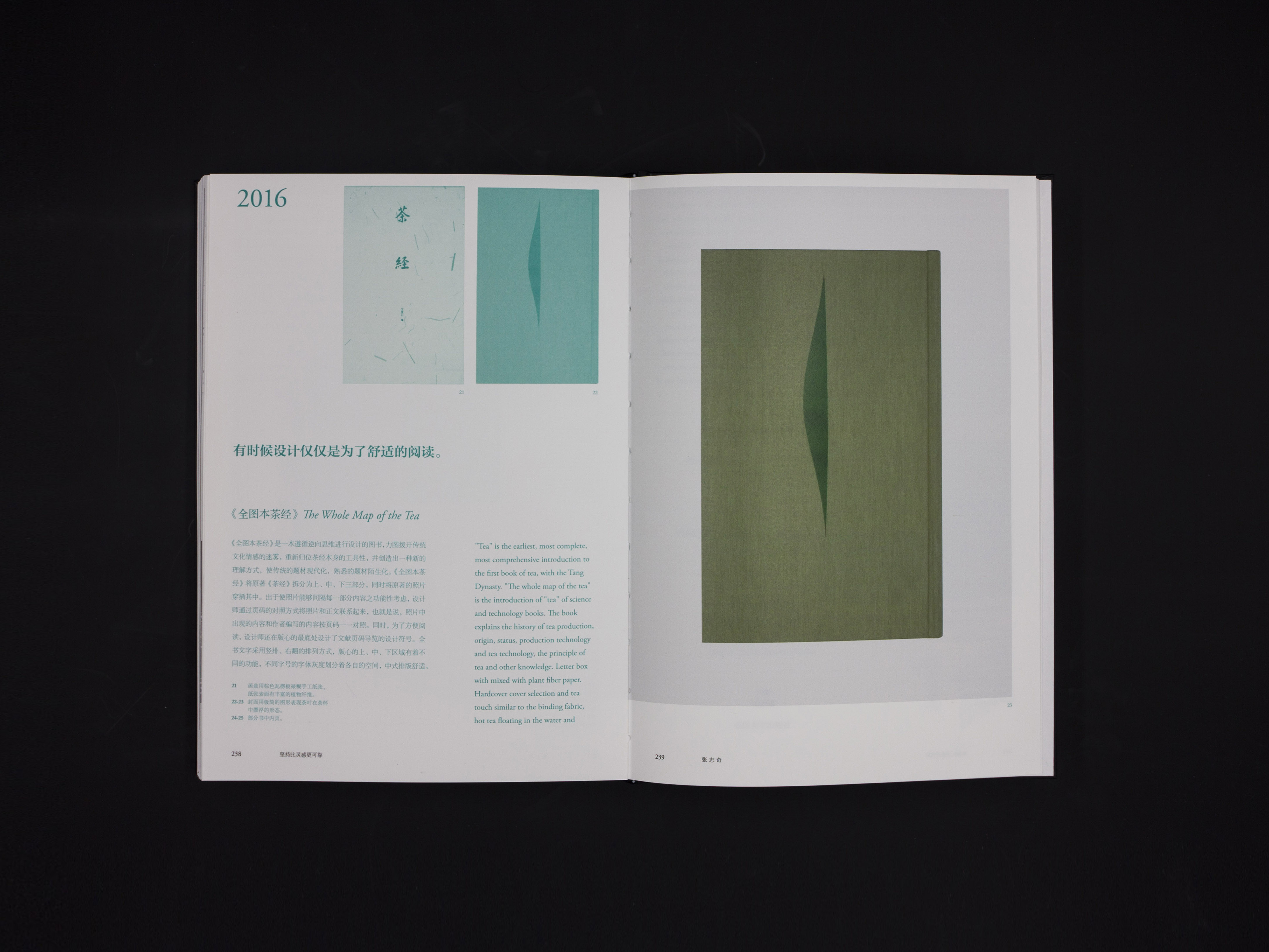 《全图本茶经》是一本遵循逆向思维进行设计的图书,试图拨开传统文化情感的迷雾,重新归位《茶经》本身的工具性,并创造出一种新的理解方式,使传统的题材现代化,熟悉的题材陌生化。《茶经》著于唐代,是现存最早、最完整和最全面介绍茶的一部专著,讲解了茶叶生产的历史、源流、现状、生产技术以及饮茶技艺、茶道原理等知识。《全图本茶经》将原著《茶经》拆分为上、中、下三部分,同时将原著的照片穿插其中。出于使照片能够间隔每一部分内容之功能性考虑,通过页码的对照方式将照片和正文联系起来,也就是说照片中出现的内容和作者编写的内容按页码一一对照,同时为了方便阅读,还在版心的最底处设计了文献页码导览的检索图表。全书文字采用竖排、右翻的排列方式,版心的上、中、下区域有着不同的功能,不同字号的字体灰度划分着各自的空间,中式排版舒适,留白大胆。封面选用与茶叶触感接近的装帧布,并烫印了茶叶漂浮于水中的图形,又看似利刃。最后,书中函盒选用夹杂着植物纤维的纸张,表现对植物生命的敬畏,也是对本书内容的升华。