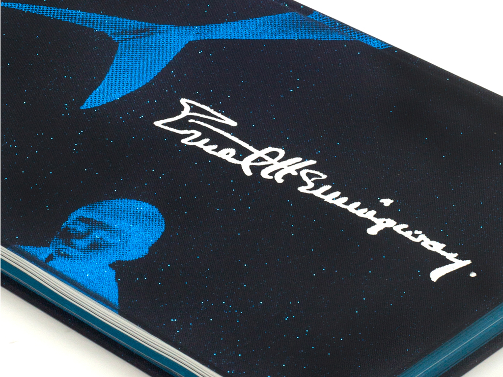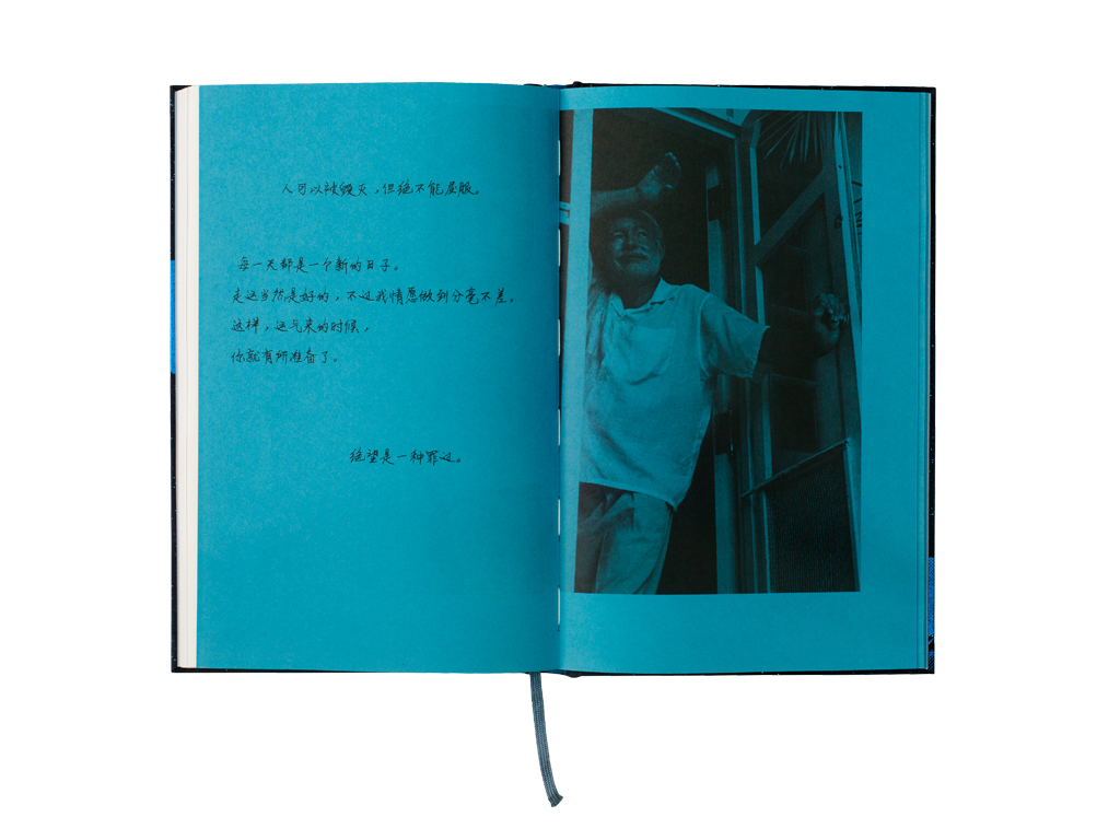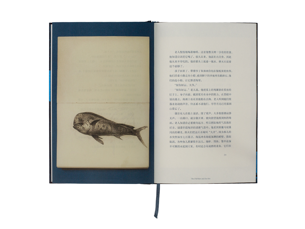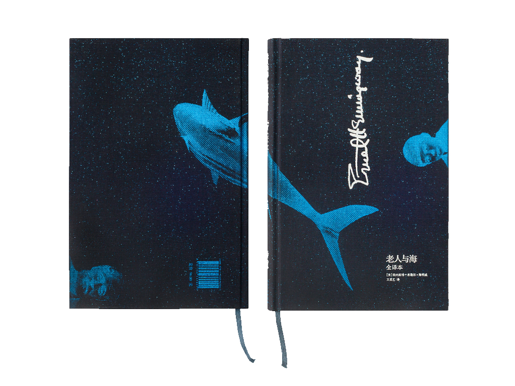 封面选用像星空一样的布面材料,这款布非常像星光投射到海面的感觉,文字和签名烫印白色漆片和蓝色烫印海明威年少和老年的头像还有书中主角蓝脊金枪鱼,封面整体的效果营造出渔夫坐在小船上向海面看去,海面上波光淋漓,水下是渔夫捕获的金枪鱼的画面。封面、封底海明威的头像暗示其戏剧的一生和悲惨的结局。小说部分5色印刷,文字为专色,插图为4色和专色套印。为了让印刷的油墨能够充分的渗透到纸中,选用了没有涂布的纸张,印刷后呈现无光的效果,这与素描的插图也非常贴合。