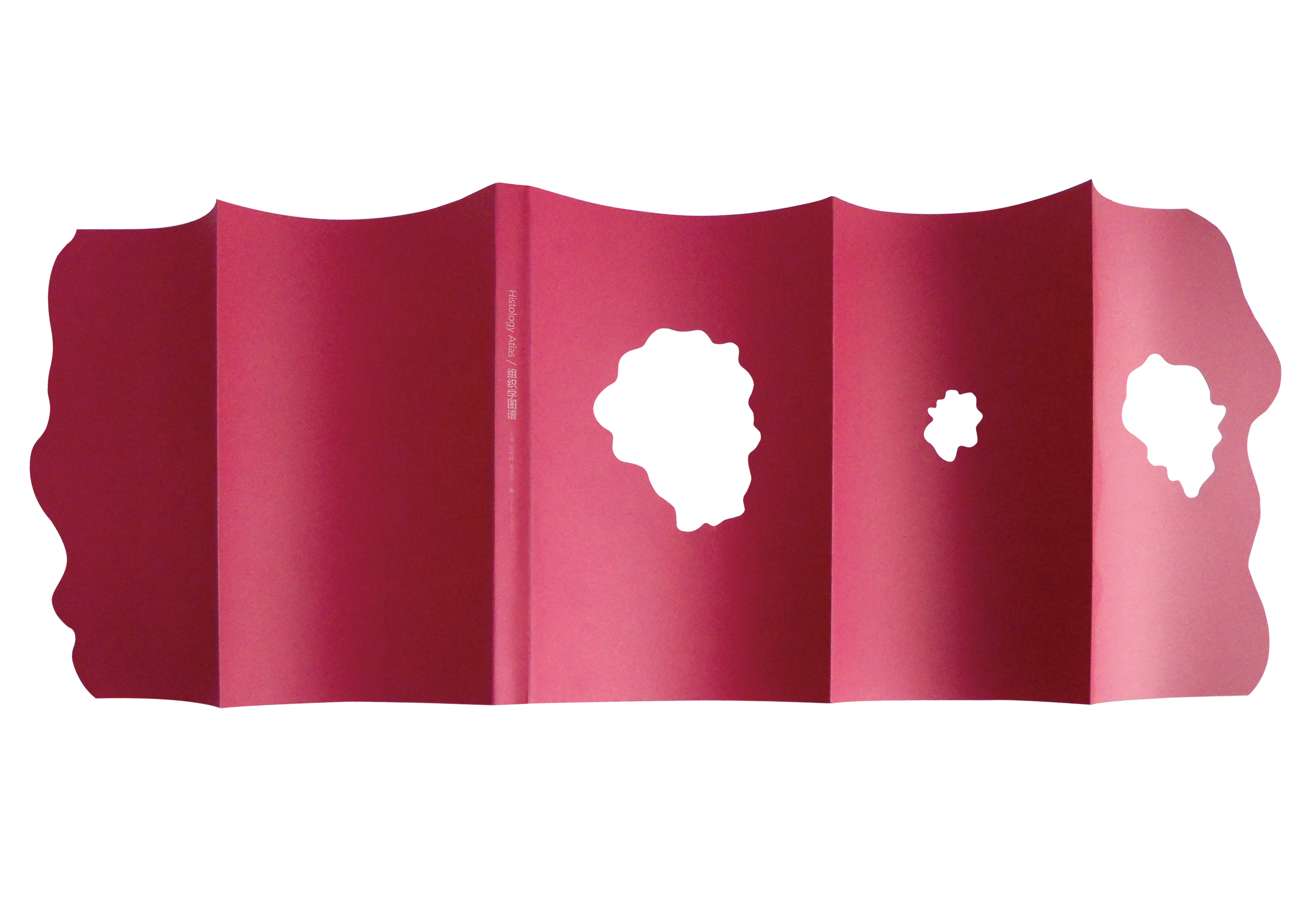 除此之外,图片跨页、单页间的变化也是我关注的一个重要方面。这本书的重点还是放在了图片的阅读性上,通过矢量图形的标注来查找相关的文字信息,以图来读图的方式正好契合了这本书内容阅读的便利性。封面的设计过程很波折,怎么能少花钱又效果好让我伤透了脑筋,最终,我选择在粉红色的纸上再印刷红色,这样就解决了模切的切口整齐又不露白的问题,和切片也更符合。通过三折的方式体现切片之感,还增加了封面形态的变化,柔化了医学书冷冰冰的感觉。