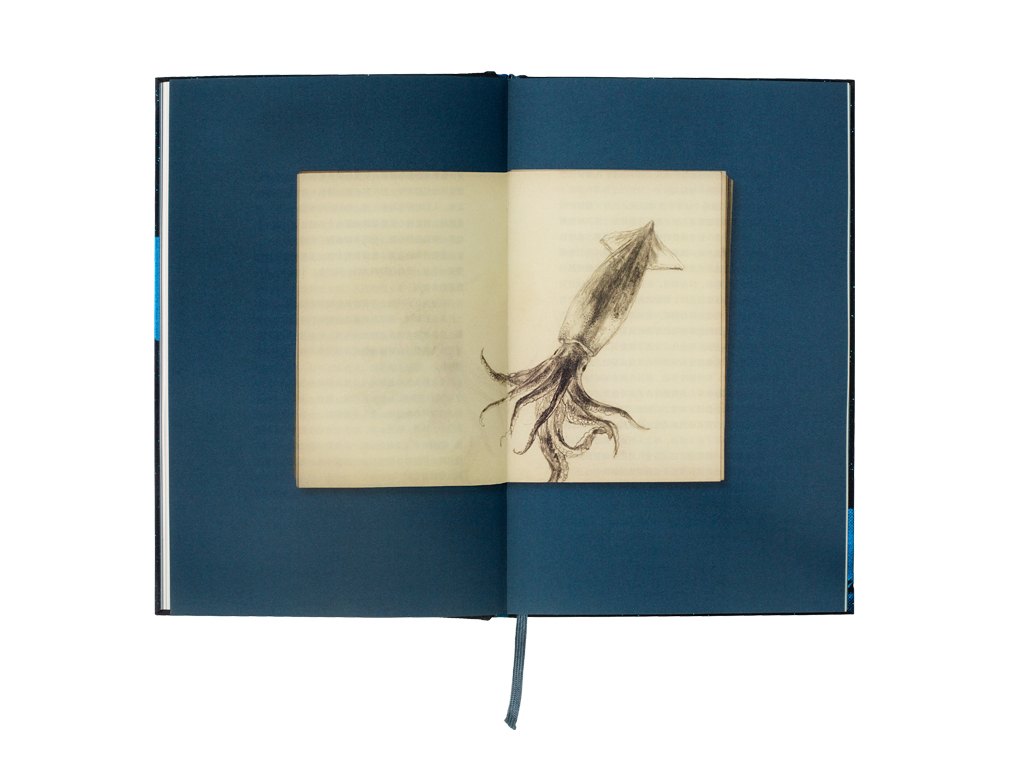 张志奇:《全译本老人与海》这本书的内容应该是大家耳熟能详的了,小说讲述了人与自然、命运的抗争。正因为内容太经典,所以要找到一种全新的方式来呈现难度就更大。以往这本书的设计多是低幼感和廉价感很强,因为内容好卖,所以也不用太设计。所谓的设计多指那些烘托故事情节的插图,是一种“入”的角度或者状态,而我的设计是从一个观察者的视角记录故事的发展,跳脱故事本事,以不同鱼类登场的顺序作为故事发展的线索,故事的设计和呈现是一种“出”的角度或者状态,形成了设计者的“我”的意识。借蓝色在书页中的深浅变化传达一种时间的递进和空间的转换,同时也暗示着故事情节的发生和层层递进,终至悲惨结局的发生。由于一直找不到合适的插画师来绘制插图,最后临近交稿,我只能自己来画了,用素描的描绘方式绘制了鱼的素描,也记录了鱼的信息。最后连同绘制的本子也一起扫描,放到书里。