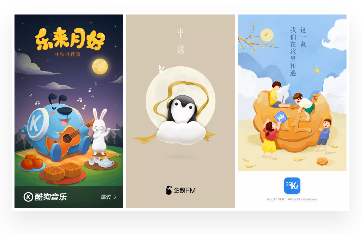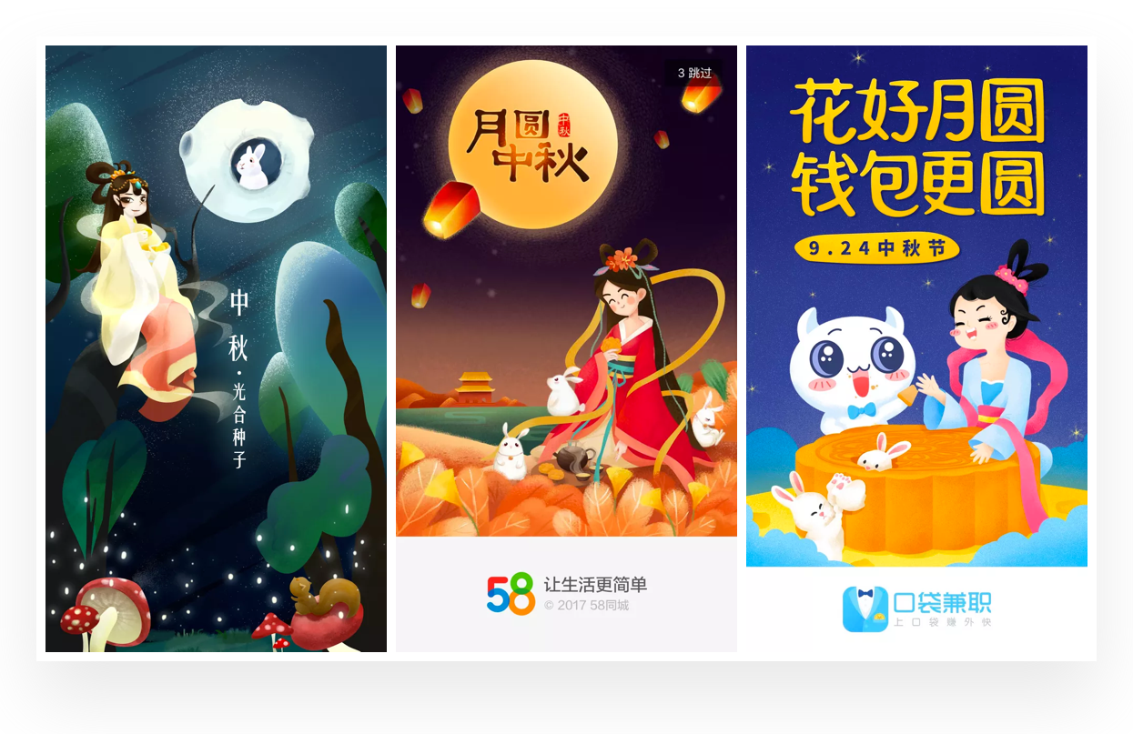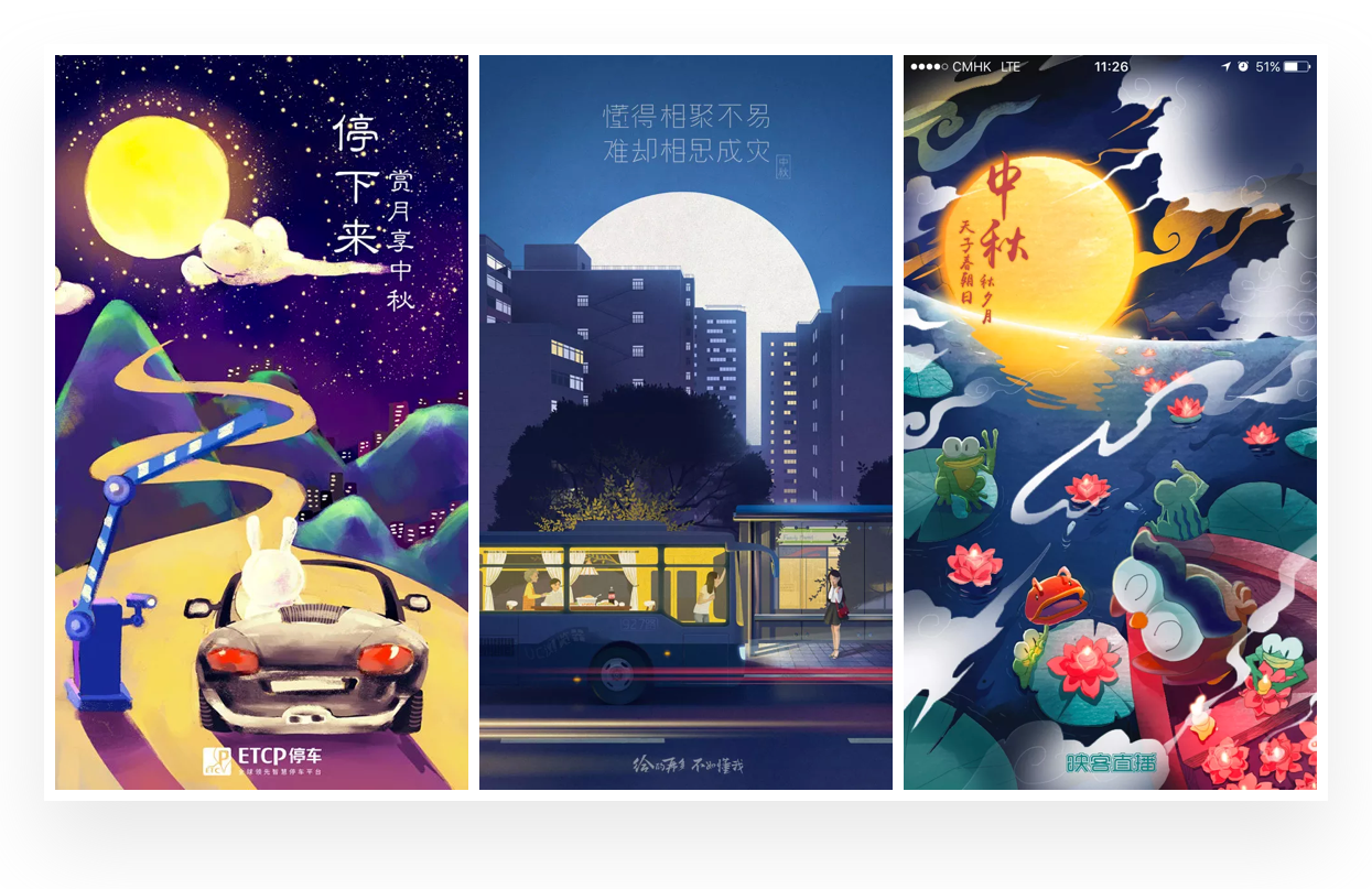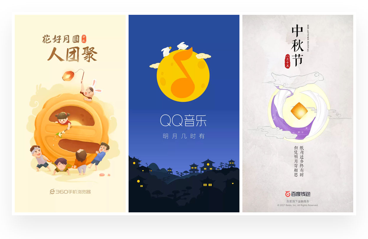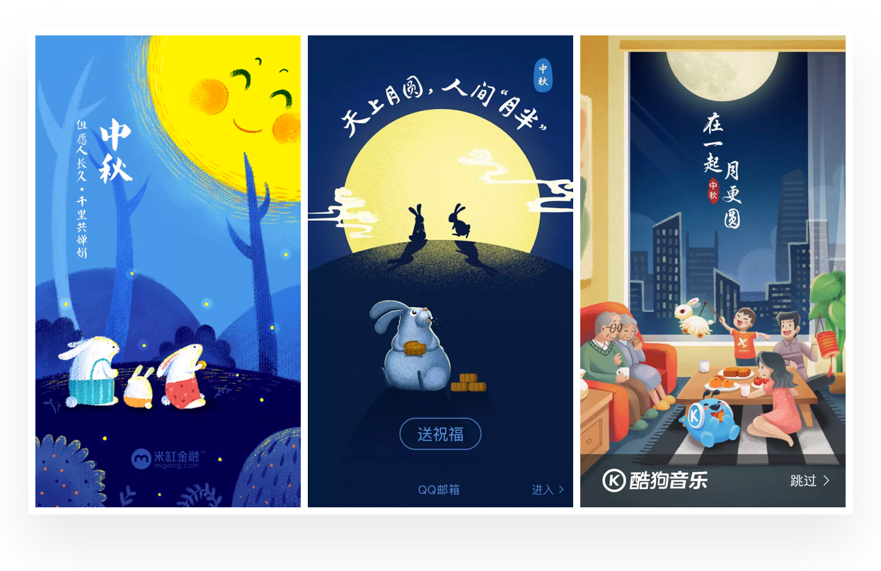 插画在闪屏设计中是非常常见的形式,搜索中秋闪屏设计作品中,几乎都是插画的表现形式。根据对中秋相关闪屏的分析,大致总结出在中秋闪屏设计中的插画表现风格与思路,希望带给你一些启示。