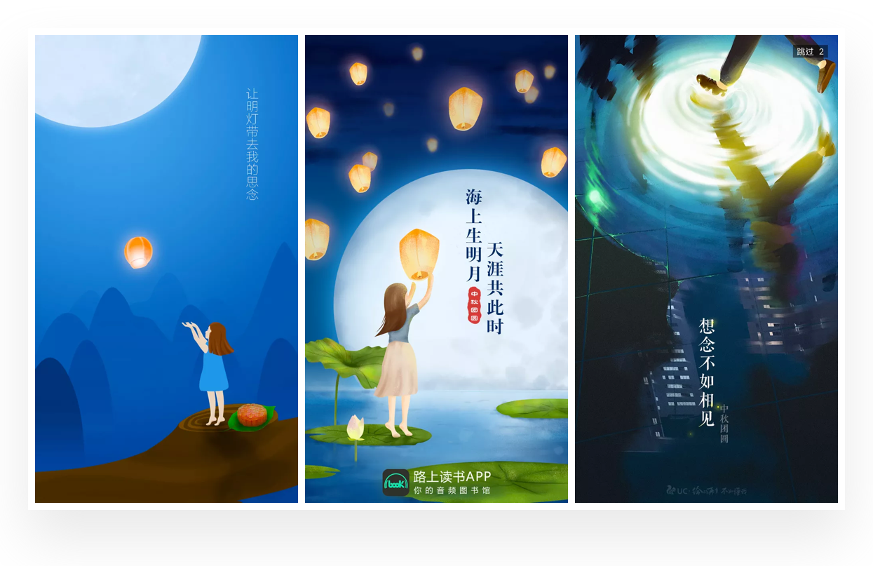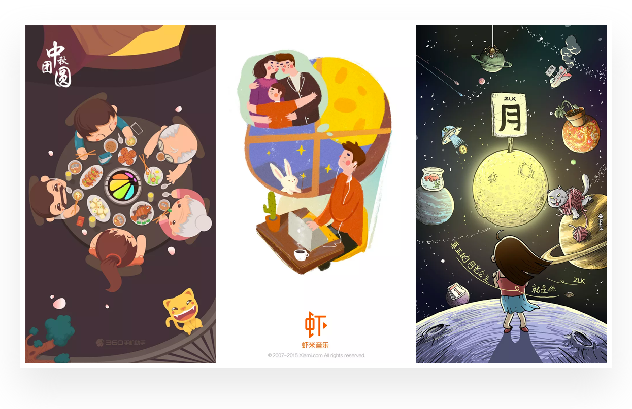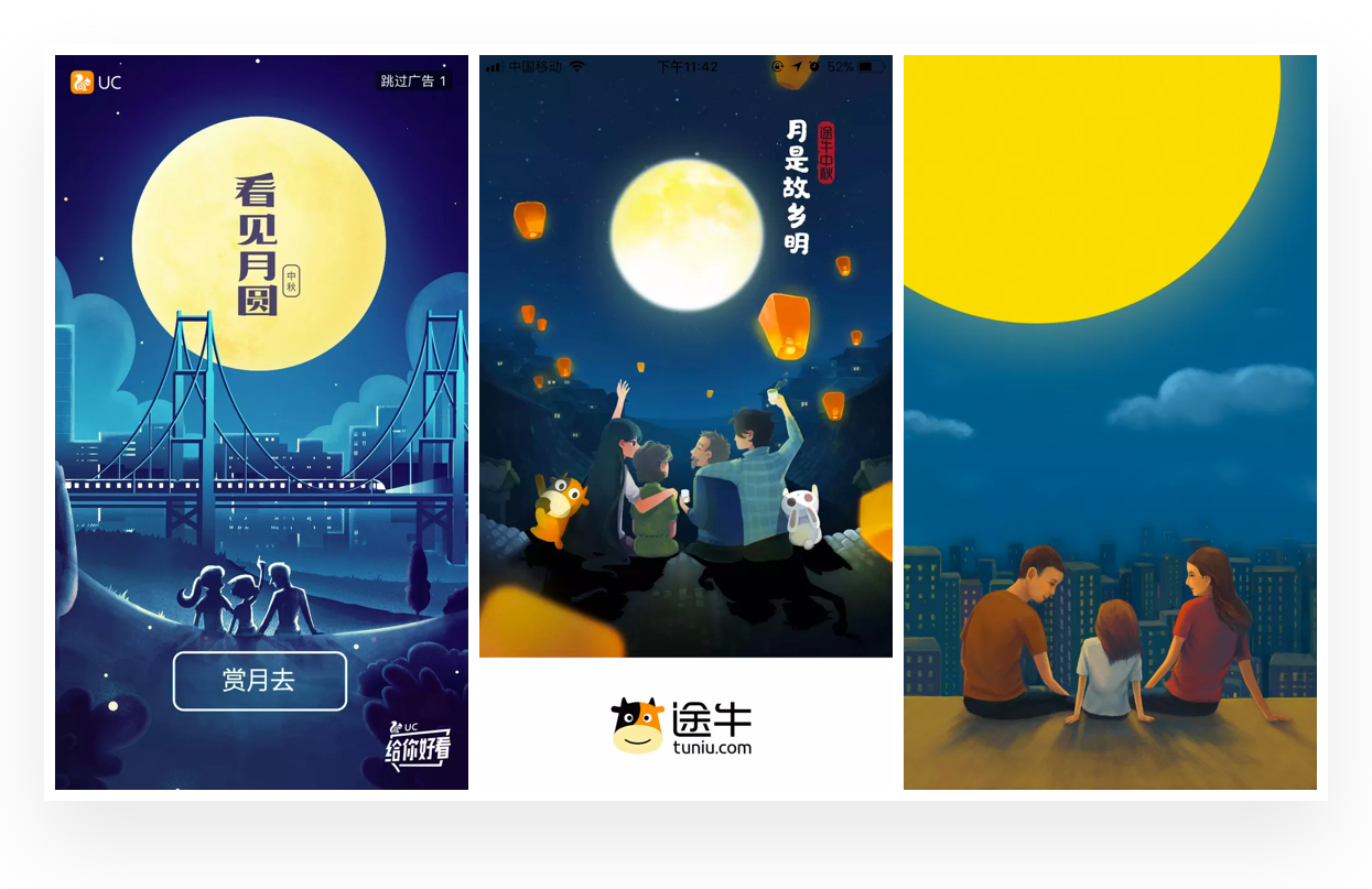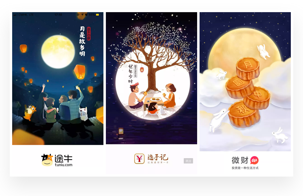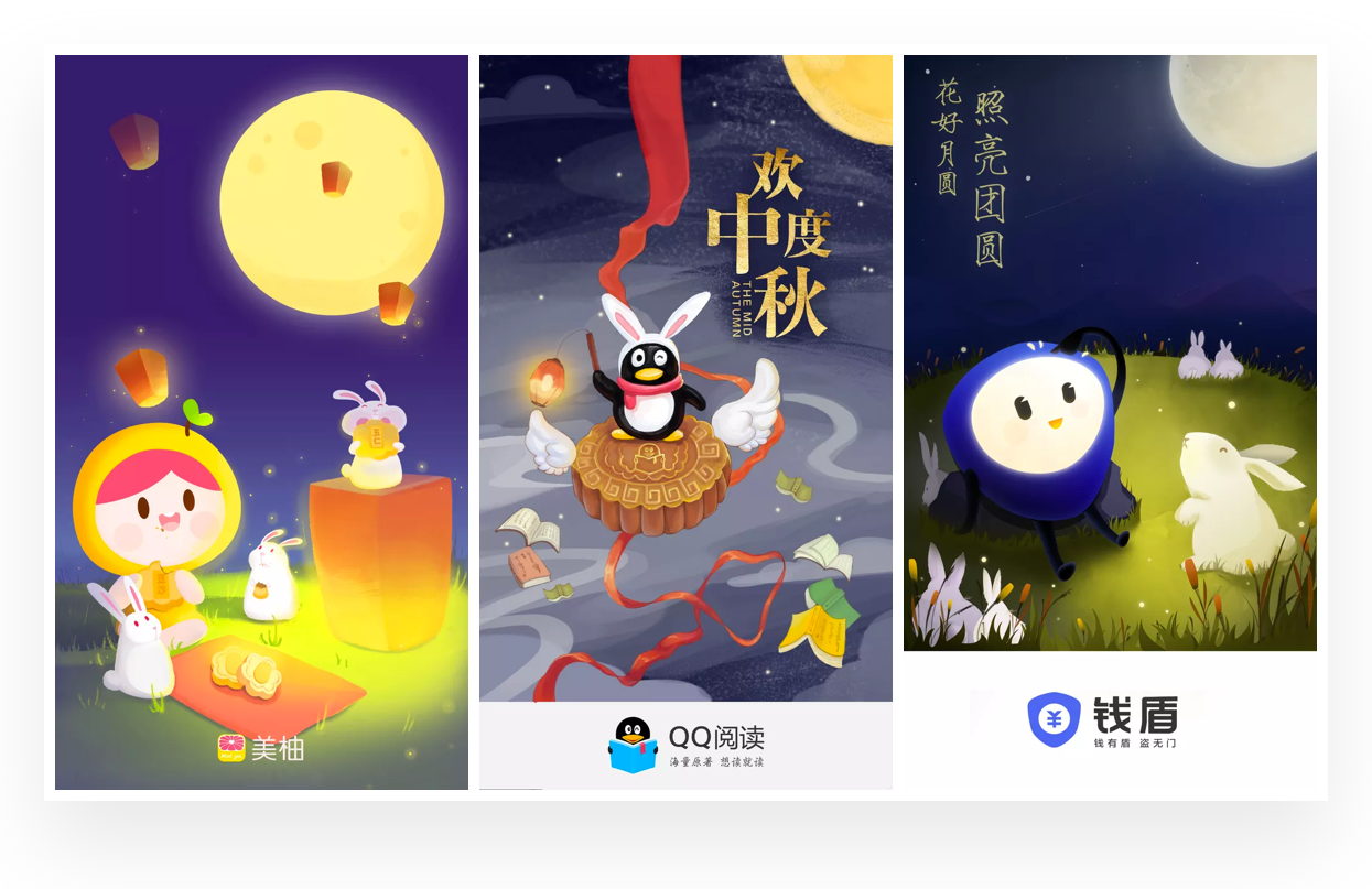 插画在闪屏设计中是非常常见的形式,搜索中秋闪屏设计作品中,几乎都是插画的表现形式。根据对中秋相关闪屏的分析,大致总结出在中秋闪屏设计中的插画表现风格与思路,希望带给你一些启示。