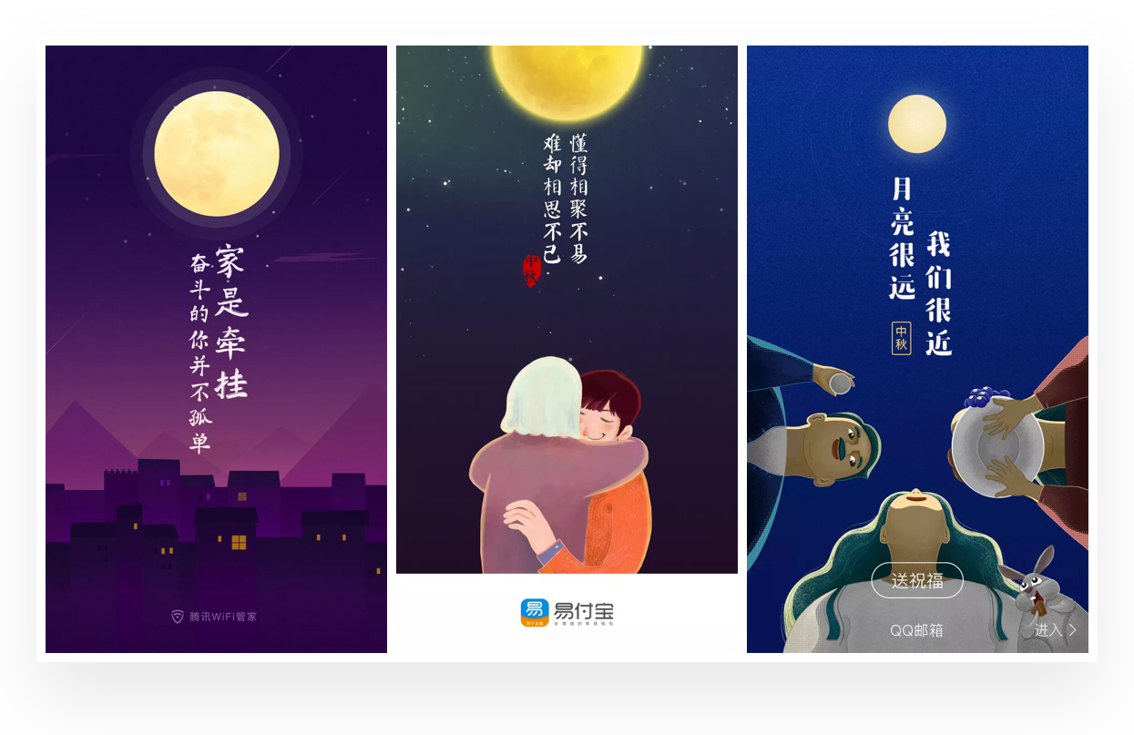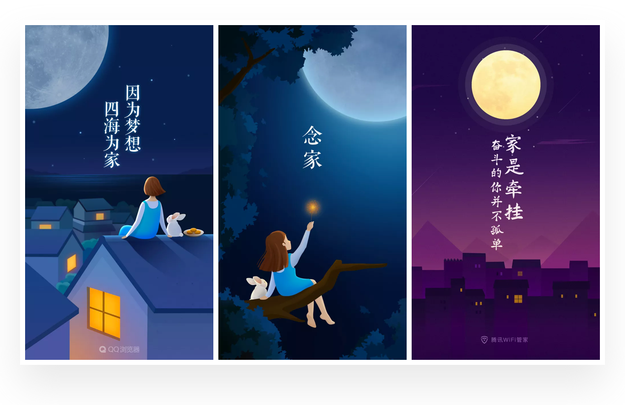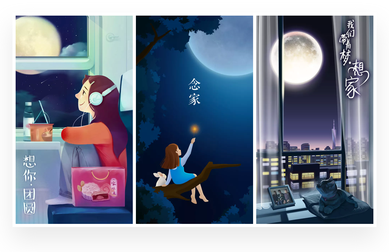 对于很多远乡异地的游子来说,中秋小长假是难以赶回团圆的,利用这样的场景结合圆月也是很能与之共勉的。一般场景中出现独立的角色或者没有人物角色,用这样的场景表现孤独,然后配合产品的服务打破这样的孤独感,与这部分游子群体产生共勉。