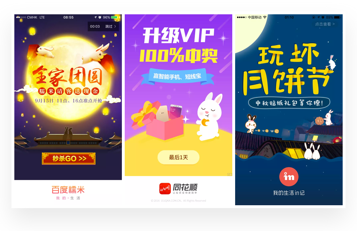 这是最为简单的手法,只要设计一幅与中秋相关内容的闪屏画面,然后直接露出品牌信息即可。