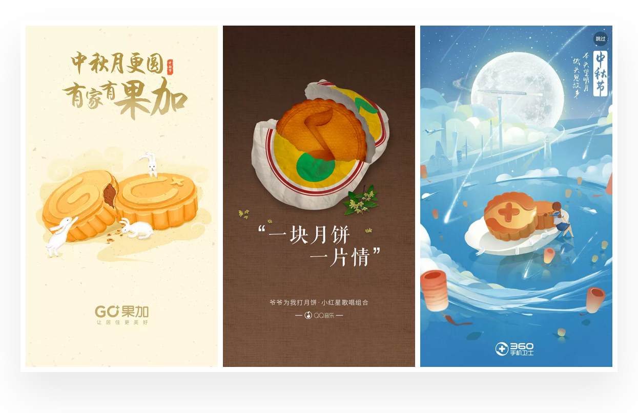 这样的设计形式比较考验品牌图形与中秋元素的融合性,一般是以LOGO图形与中秋相关元素进行同构。中秋相关元素包含:月饼、圆月、玉兔等,如360手机浏览器的闪屏设计就是LOGO图形结合月饼造型同构而成。