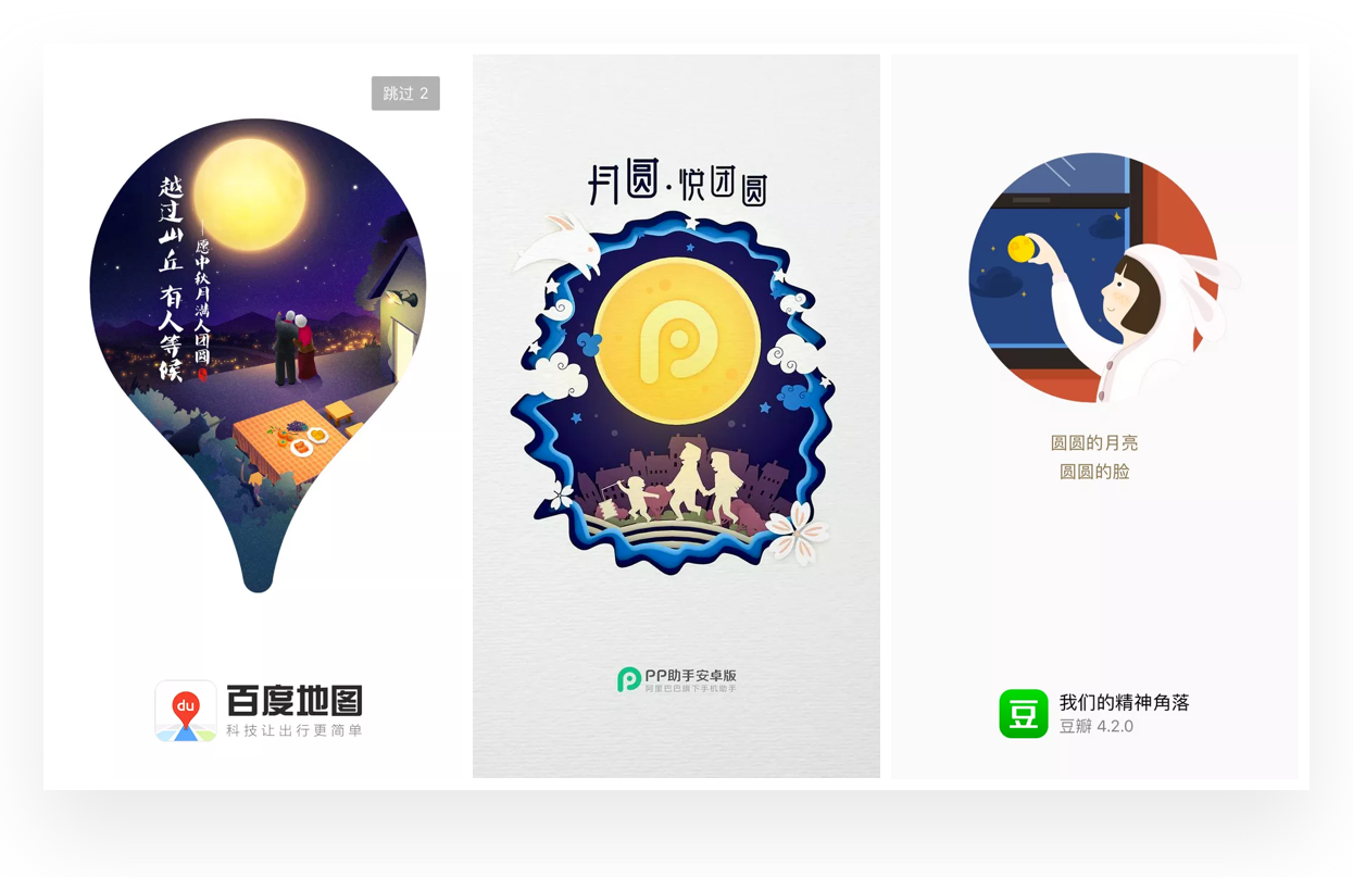这个设计形式较为少见,是利用LOGO图形或者其他特征图形的外形形成剪影,然后结合中秋场景插画,是比较简单的设计手法之一,如百度地图就是以这样的形式设计过一次中秋主题的闪屏作品。