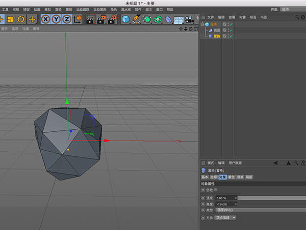 3.为模型添加置换工具,目的是增加凹凸不平的细节。置换添加后,需在其着色属性找到着色器,点开箭头选择“噪波”。凹凸强度可在对象属性面板下的“强度”及“高度”选项自行调节。