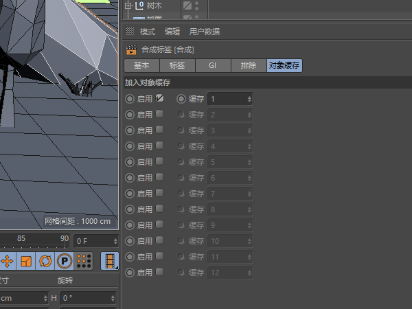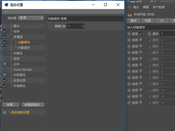 2.在渲染设置的“多通道渲染”中添加“对象缓存”,并选择对应的群组id(群组id与之前启用的缓存id一致)。可为多个物体添加对象缓存,对应缓存 1,2,3...,然后多通道处也需添加对应个数的“对象缓存”,并选择对应的缓存id