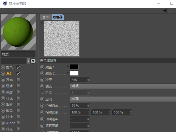 创建新材质球,去除其他属性,仅保留“颜色”。若想添加原作岩石上的纹理的,则勾选“漫射”,并在其“纹理”一栏处添加“噪波”,然后调整“噪波”的全局缩放。设置完成后拖到对应模型上即可。