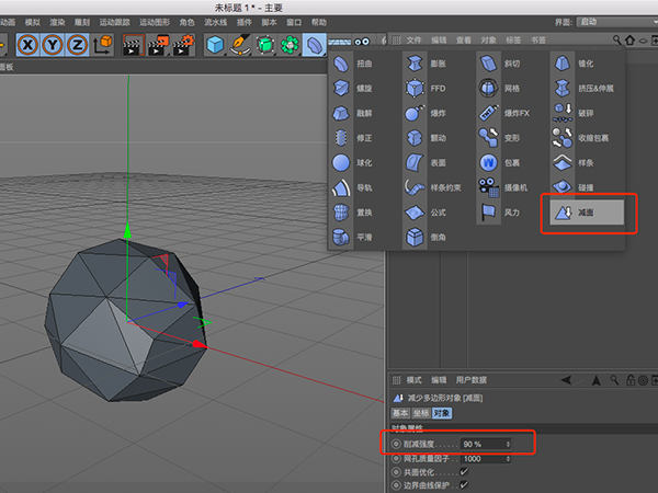 2.在扭曲工具组下找到减面工具,为模型添加。削减强度可适当调节