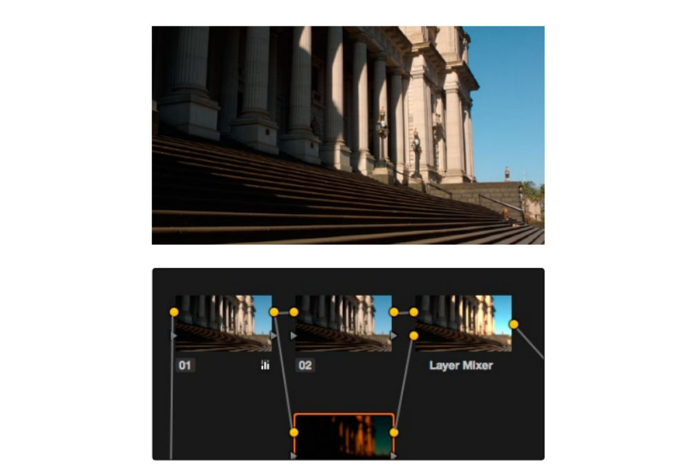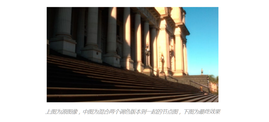 达芬奇是以节点为基础来处理图像的,这使得它很容易使用奇特的复合节点结构来创建特殊效果,比如通过layer节点把两个不同调色版本混合到一起,创建出一个彩色的辉光效果。如下:
