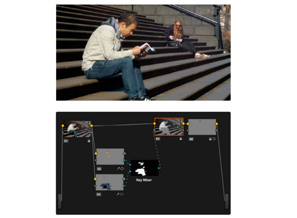 你也可以创建复杂的节点结构来创建特殊的mask,然后用来单独控制图像中某一部分元素。比如,你想把图像中的演员单独出来,然后把背景调整成单色,那么你可以通过创建多个key(hsl qualification),并通过key mixer合并它们,之后你要的效果就很简单了。