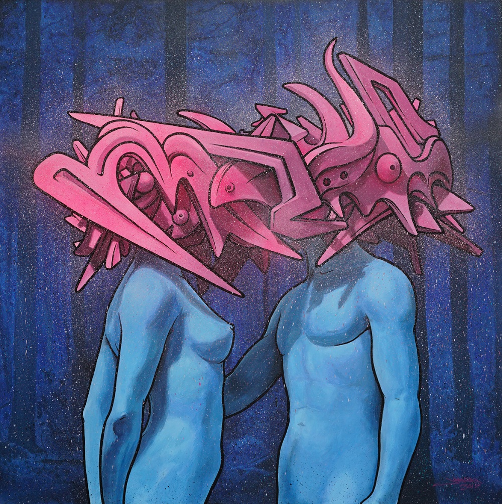 Jahan:我的作品经常使用蓝色和粉色,蓝色代表着开心,心理学说长期看蓝色会给人带来平静、开心的感觉,粉红色看久了就会“变态”,因为粉红色其实是代表死亡的,切开的肉是粉红色的,所以我觉得这两个颜色拼起来就好像阴和阳的调和。