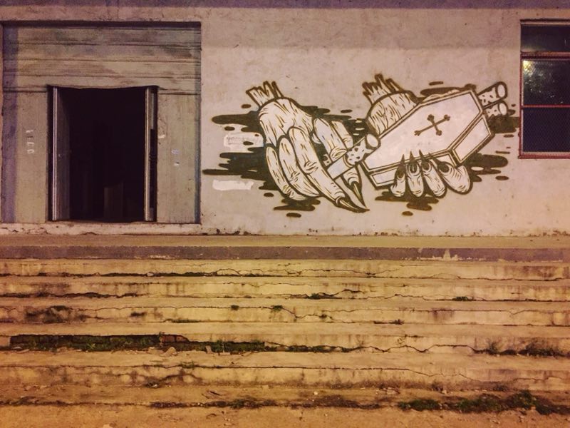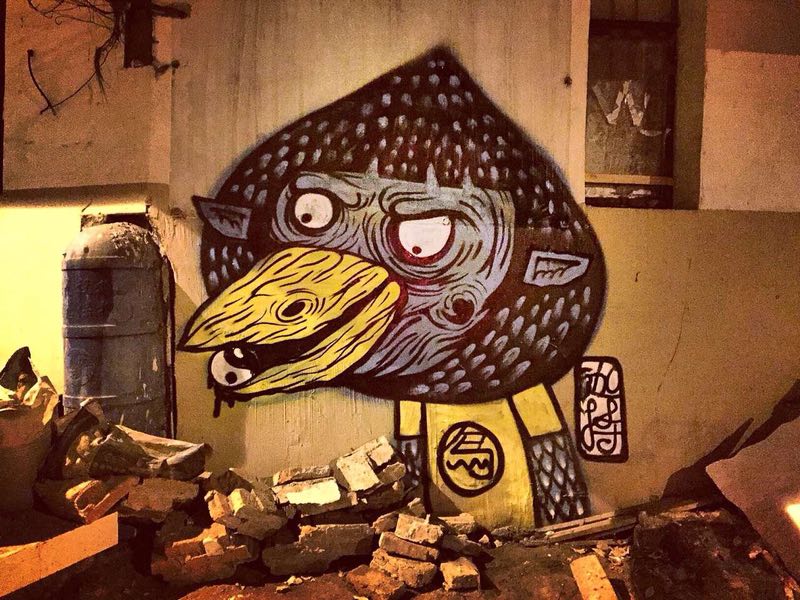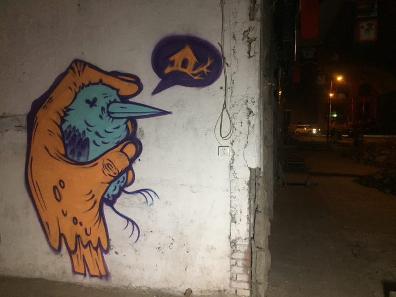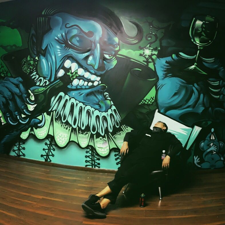 Say:我是美术艺考生,但那时候并不喜欢画画。几乎每天都是偷偷跑去网吧玩游戏,一次在玩极品飞车的时,无意间在游戏里的街道上看到了涂鸦,我把我那辆爆改的GTR停在那里好久……觉得这种在墙上画出来的东西太酷了!对于有美术基础的我来说似乎不成问题,无非是纸上到墙上。于是回家后我用水粉在墙上画了一些字母“F*CK” “LOVE”“BITCH” 当时我觉得自己简直是一个艺术家! 沉迷之后开始通过网络去了解涂鸦文化,知道了一些名词和相应的表现方法。2008年大学二年的时候认识了贵州的涂鸦前辈MISU22 。开始了正式的用喷漆涂鸦,前辈教会了我很多实战技巧,如今依然受用。那时候我每个月1500块生活费,有一半的钱拿来买三和、可立美。这一路走下来脑子里都是怎么做,在哪里做,做什么牛逼。目的单纯到没有目的,很怀念那时候拿起喷漆兴奋到手抖浑身发热的时光。