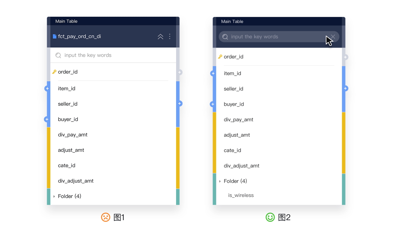问题分析:图1是用户在Dataphin中所创建的一张逻辑表,我们需要保证用户在屏幕内尽可能多的获取信息,因此逻辑表中的空间利用就显得很重要。在原有交互中,我们为用户提供了搜索功能,同时我们也在思考有没有更优的信息布局方案,可以为用户展示更多的数据。