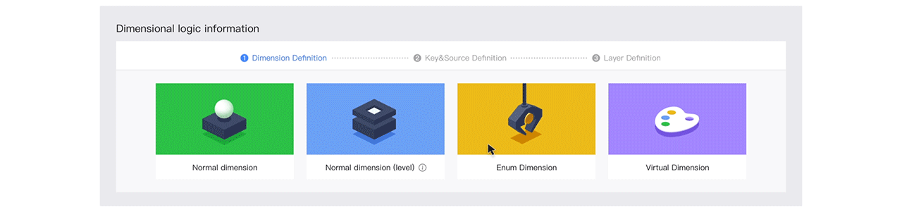 在Dataphin中,用户在创建逻辑表之前,会经过一系列繁琐的配置工作,如下图中,用户需要经过“定义维度”-“定义主键&来源逻辑”-“定义层级”三个步骤。由于操作流程复杂,我们为用户设计了铅笔线动效,让用户时刻明确自己操作所处的位置,也方便回退操作。
