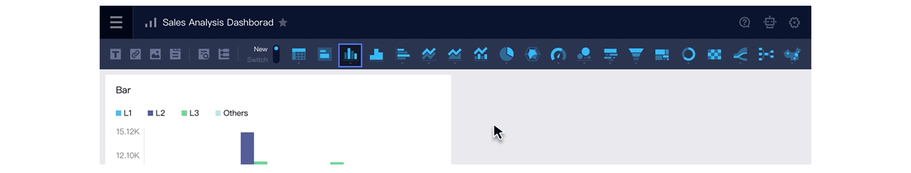 问题分析:在QuickBI中,同一套icon需要应对两种不同的使用场景:当用户没有选中任何图表的时候,点击任意类型的图表icon,即可新建一个图表;当用户选中某一创建好的图表时,再点击图表icon,则是为该图表切换类型。所以为了确保用户的认知清晰,我们需要将两套使用场景区分开。