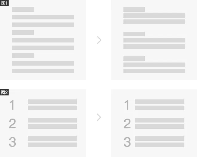 下图2左边的排版中数字看起来像一个单独的单元,与内容无关。而图2右边的排版缩小了数字与内容之间的间距,使它们靠的更近了,这样一来,我们很容易就发现了它们之间的关系。