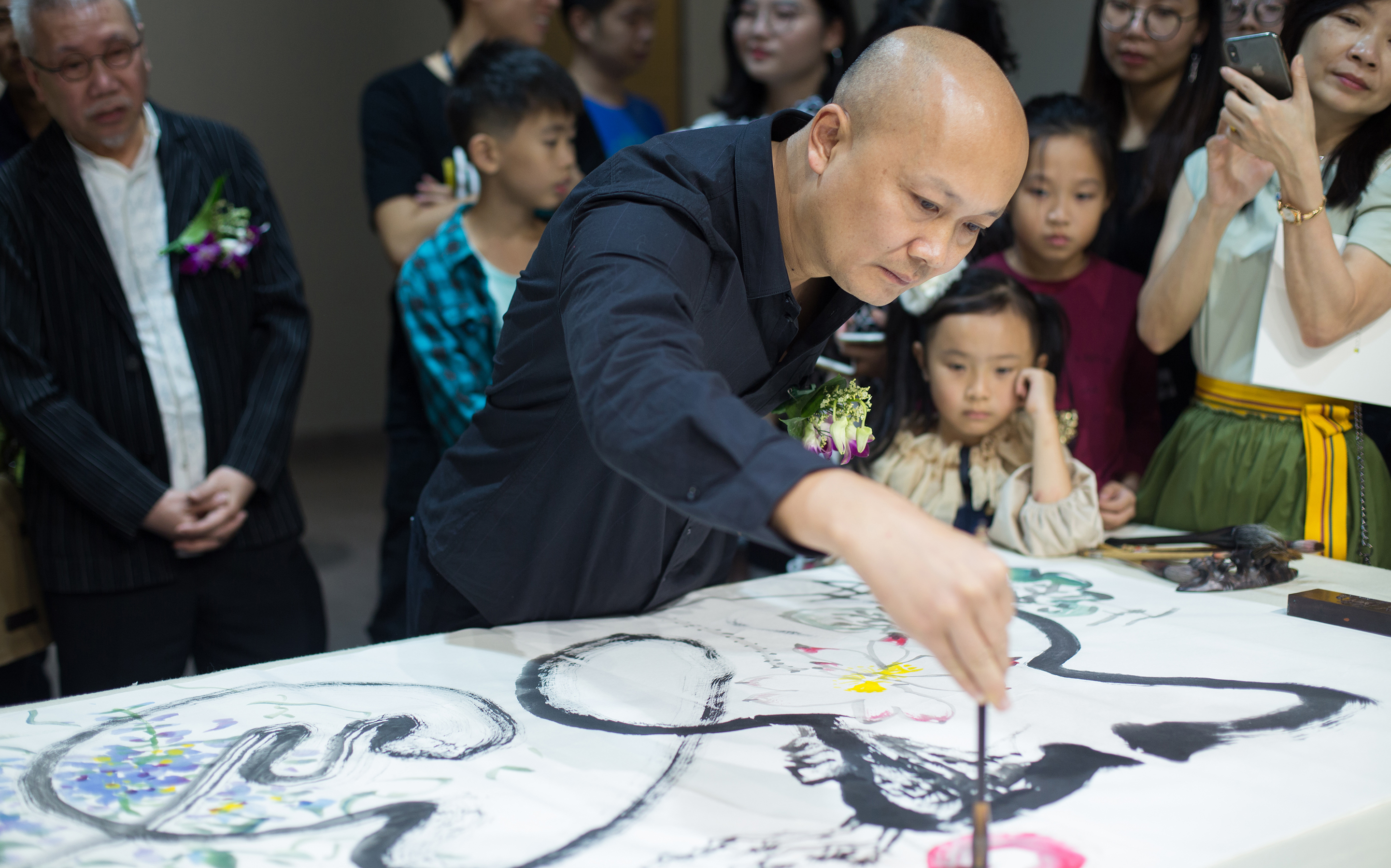 开幕式之后,靳叔与到场嘉宾互动,大家共同围绕一个主题创作作品,在六尺宣纸上,靳叔首先书写了一个大大的“缘”字,随后,汕大邵丽华老师、潮州陶瓷学校郑子菲老师、汕大徐岚教授、校友陈斯壁、揭阳市装饰行业协会常务副会长郭晓琳一起参与创作,用自己擅长的方式表现“缘”,大家一起借水墨之情,再续水墨之缘。