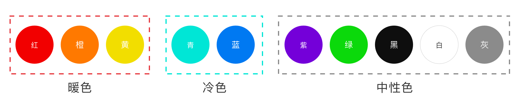 色彩心理学上认为红、橙、黄可以让人联想到阳光、火焰等,能提高血压以及心跳次数、刺激自律神经系统、增强食欲,因此把它们称为暖色调。而青、蓝色与寒冷、夜晚联系,让人觉得静谧、消极等,故名为冷色调。还有一部分色彩能使人产生轻松的情绪,叫做中性色调,包括紫、绿、黑、灰、白。