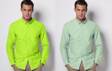 借用一张图片来看,左边的模特穿了一件骚绿骚绿的衬衣,看起来像是便宜的地摊货,而右边穿上降低了纯度的衣服的男模则秒变高级~ 所以说,即使色彩的明度比较高,但是纯度较低的话,颜色会更显高档。