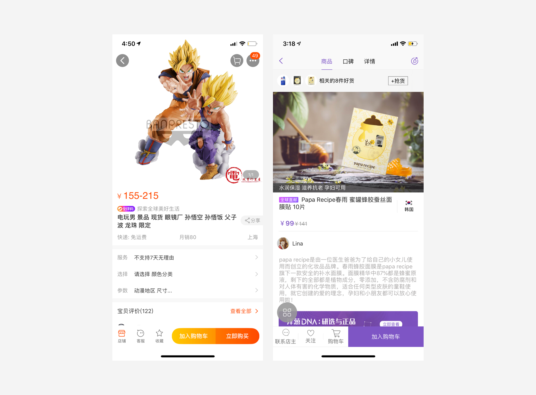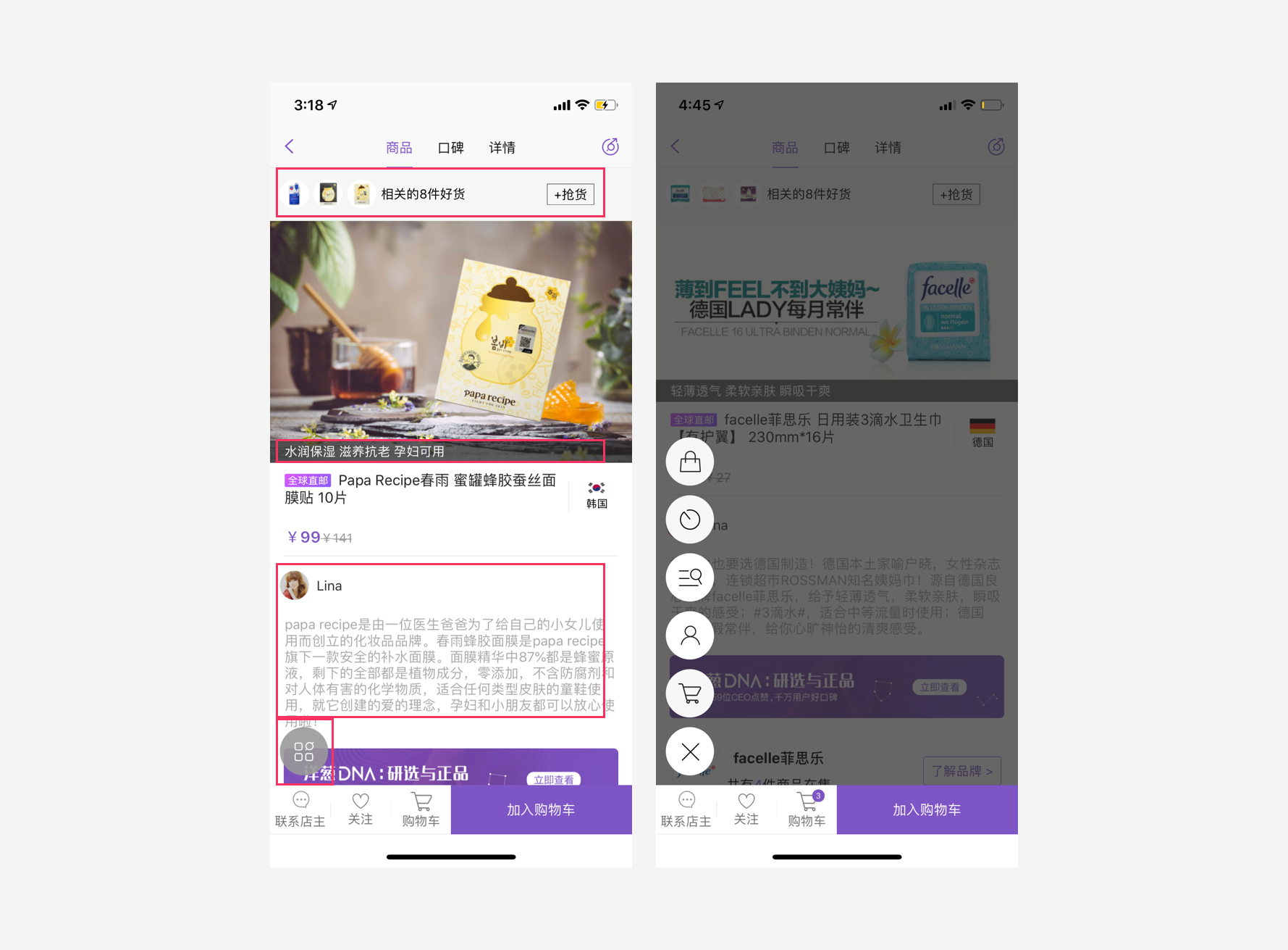 俗话说的好,详情页乃兵家必争之地,得详情页者得天下...首先我们来看看详情页的首屏。可谓是百花齐放了,业务、用户、场景决定了功能与信息架构。电商详情之所以复杂就是因为它需要承载很多复杂的场景,所以很多时候并不是所有的信息都是有用而你又无法简化。这显然不仅仅是普通的电商所呈现出来的商详,而是拥有“社交背景的商详页。”
