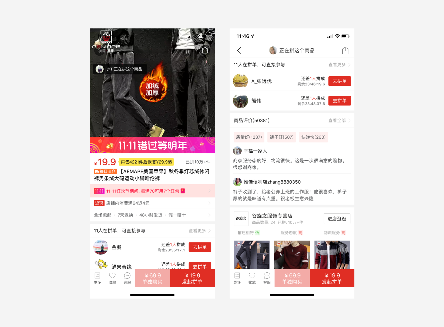 然后我们熟悉的购物车功能没有,因为拼多多也是限时拼团电商,要拼团先支付,所以没有购物车的场景。而大家看到的单独购买这个锚定效应也是运用的很直接了,应该没有人会用更高的价格还死命的加购物车吧?
