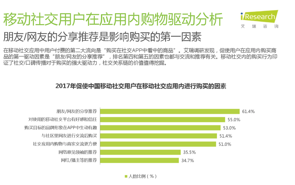 2017年艾瑞咨询的移动社交用户在应用内购物驱动因素分析,我们能发现社交关系链的价值还是非常值得挖掘的呢