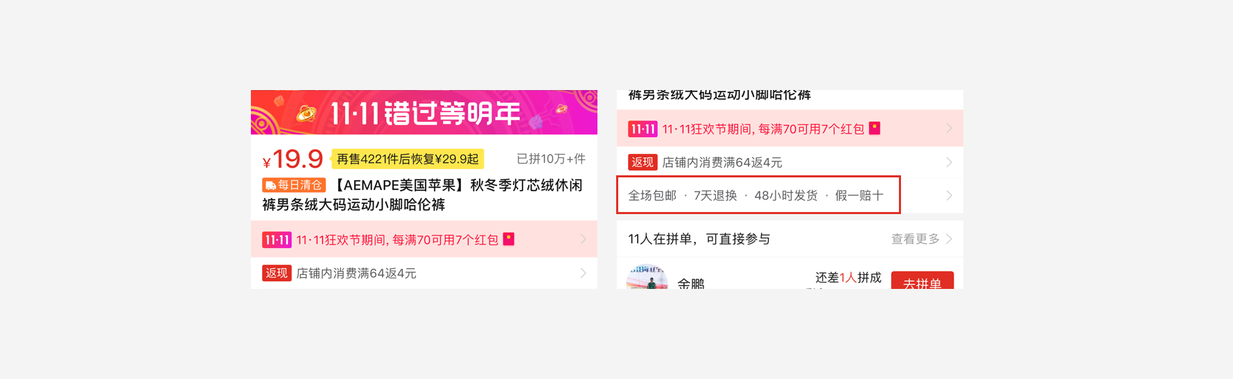 然后首屏的上半部分依然是帮助用户建立认知的信息介绍区域,同样也是大图置顶的方式,但是细心的小伙伴在对比的时候能发现拼多多其实把全场包邮、假一赔十等特色信息放在了第一梯队的板块,很明显,它想告诉大家我们的服务是一流的,不会有假货,因为全是山寨:D