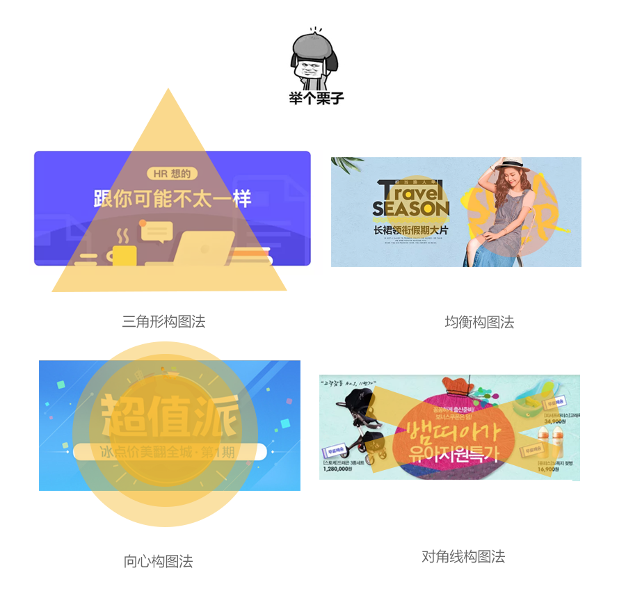 简单原理适用于设计中的三角形构图,均衡构图,对称构图,向心构图,摄影中的对角线,X型构图等。这些构图方式都是为了把复杂的信息元素通过简单的方式让观者易于理解