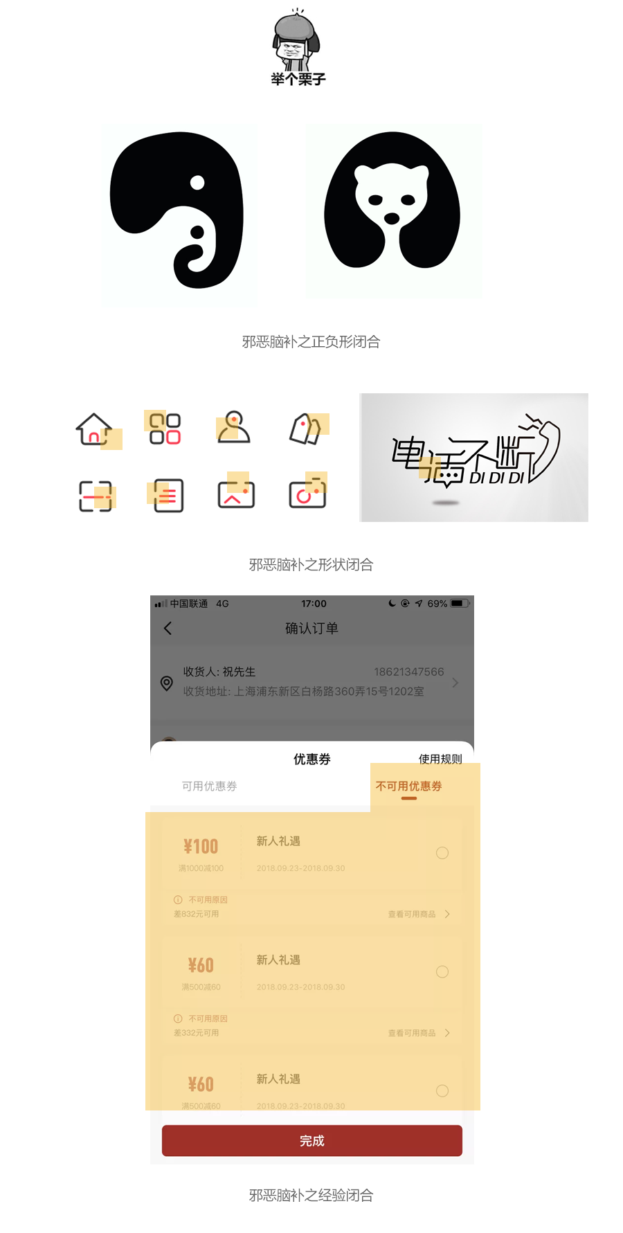 人们在观察熟悉的视觉形象时,会把不完整的局部形象当作一个整体的形象来感知。简单来说就是脑补空缺的部分通常用于logo设计图标设计和字体设计