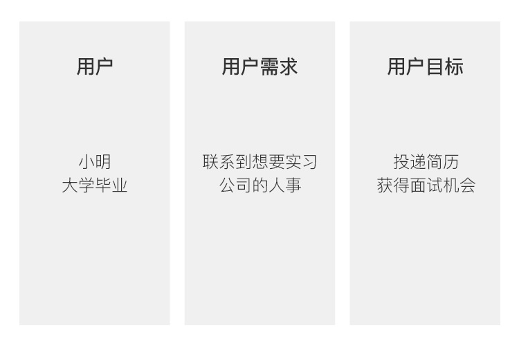 这里,我们可以尝试构建一个用户画像和背景故事,将前期整理的信息在这一步合成一个易于浏览的背景板块,即“他们是谁...他们想做什么...来达到什么目的(最终目标)”请注意,这里的用户背景是完全客观的信息收集的结果,并非设计师或产品经理的想法。例如:”小明是一名刚毕业的大学生,他想通过招聘软件直接联系到想要去实习公司人事,来投递他的简历,以便获得一次面试机会”。