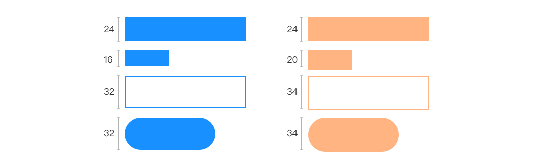 如图所示,左边采用8为原子单位,所有的尺寸都是8的倍数,能很好的确定设计规律。右边的尺寸比较随意,没有规律所循,设计一致性比较难达到,若有新的组件,那尺寸该如何定呢,都是比较麻烦的事情。所以,确定好你的原子单位是很重要的,而通常我们就是采用8为原子单位。