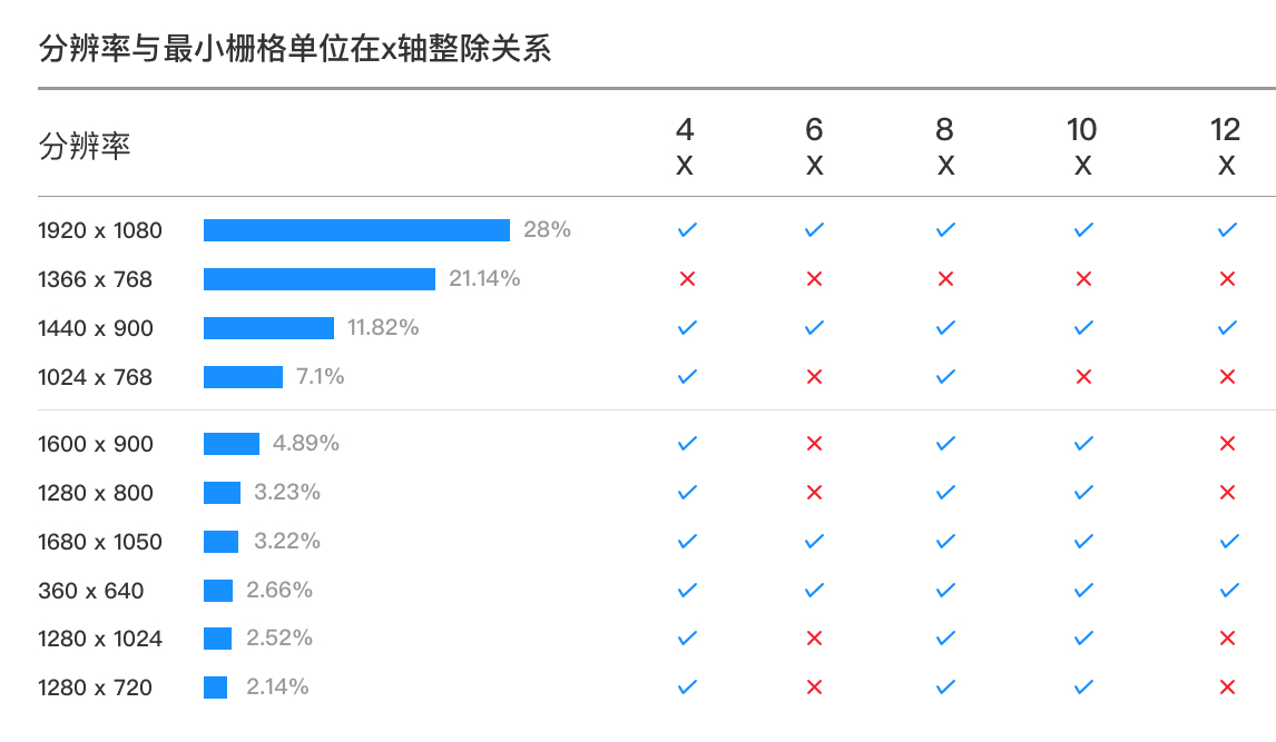 基准屏幕确定好后,那我们开始来确定下栅格的原子单位。从上面的屏幕分辨率可以看出,屏幕的尺寸都为偶数,为了保证我们的基本单元能够被整除,我们需要确定最小尺寸的单位,通常我们定为8。为什么是8,而不是4、6、10、12呢,我们可以看看下面的这张图。4和8在x轴整除率是一样大的,如果算上y轴,4的整除率是最高的。不过4太小,有时候区分不明显,设计需要反复修改,在这个过程中设计成本会很大。