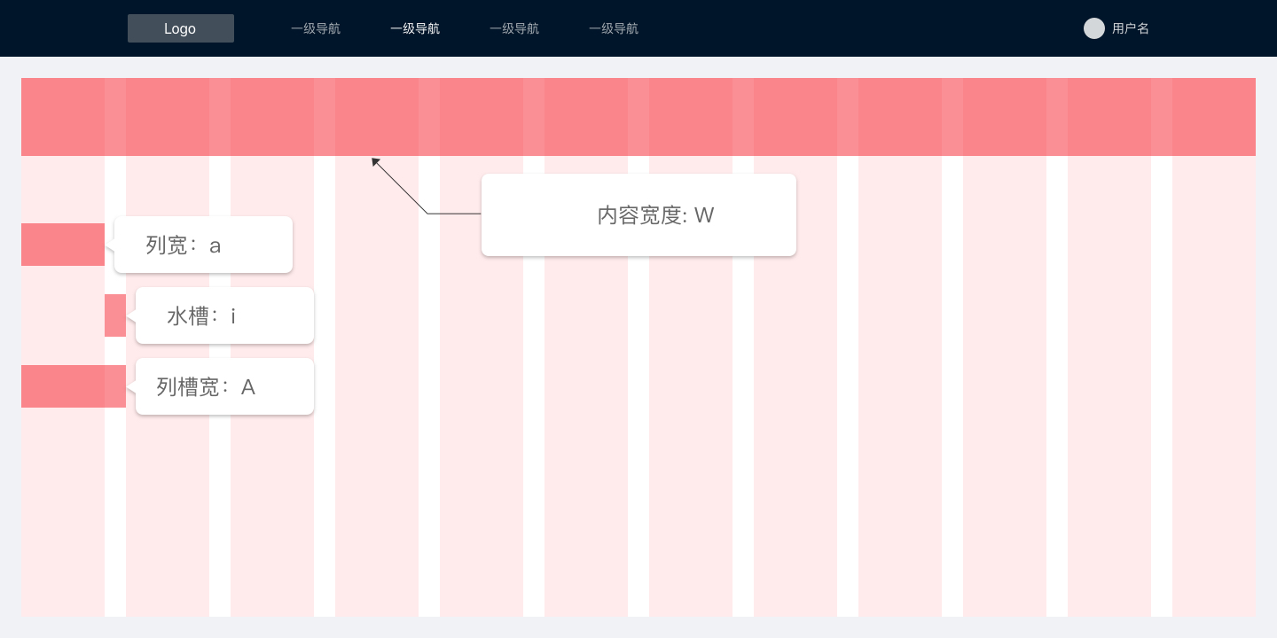 比如,本设计尺寸以1440px为基础,那么两边间距设为24,从而得出W=1440 - 24 - 24 = 1392,水槽宽度也定为i=24=8x3,设置为12列:
