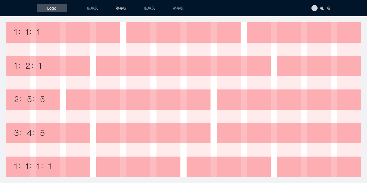 现在,我们公式算法搞清楚后,我们就来进行排版设计。以12栅格系统为例,一个12栅格系统可以根据业务需要被等分或者不等分,比如,1:1:1、1:2:1、2:5:5、3:4:5、1:1:1:1,具体采用哪种比例的组合需要我们根据自己业务需求来定,我们此处所说的比例实际上就是具体内容的宽度。当然,如果你栅格是24,那么你的比例会更加细致,排布也更多变