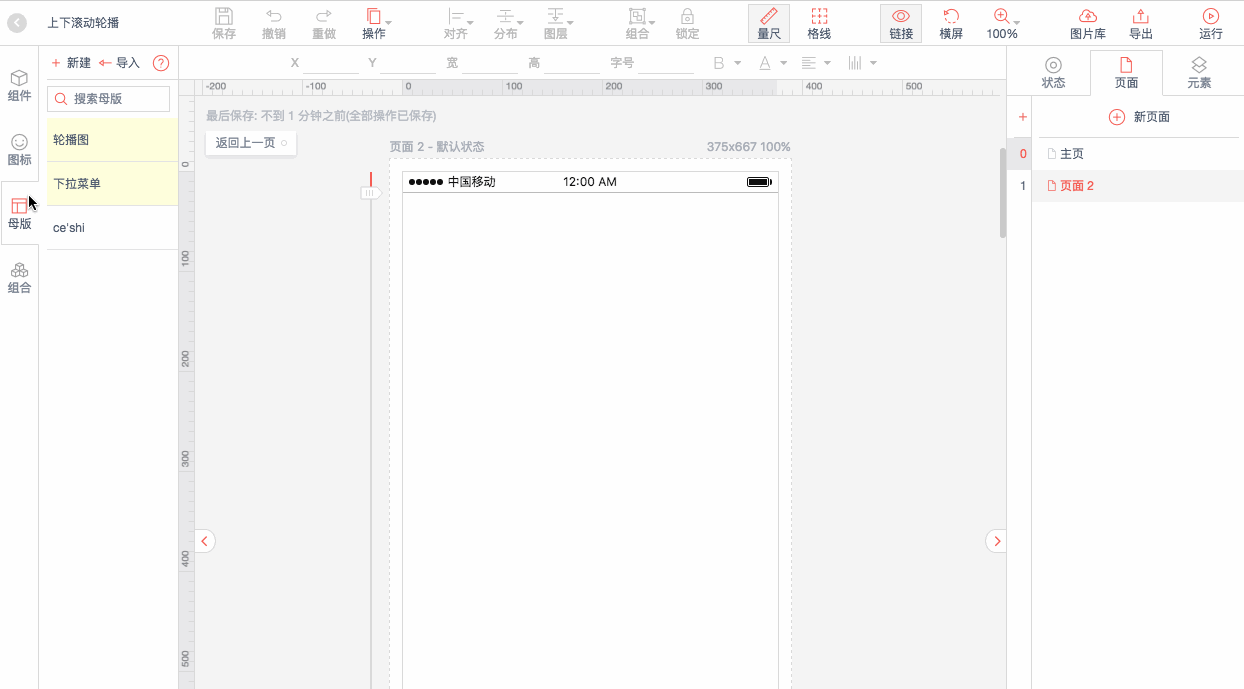 通过全局手势,页面1链接到页面2,页面2链接到页面3,页面3链接到页面1;其中在链接页面时,将定时器设置为1秒;动效时长设置为1秒;转场动画设置为下移入。母版就设置完成了。