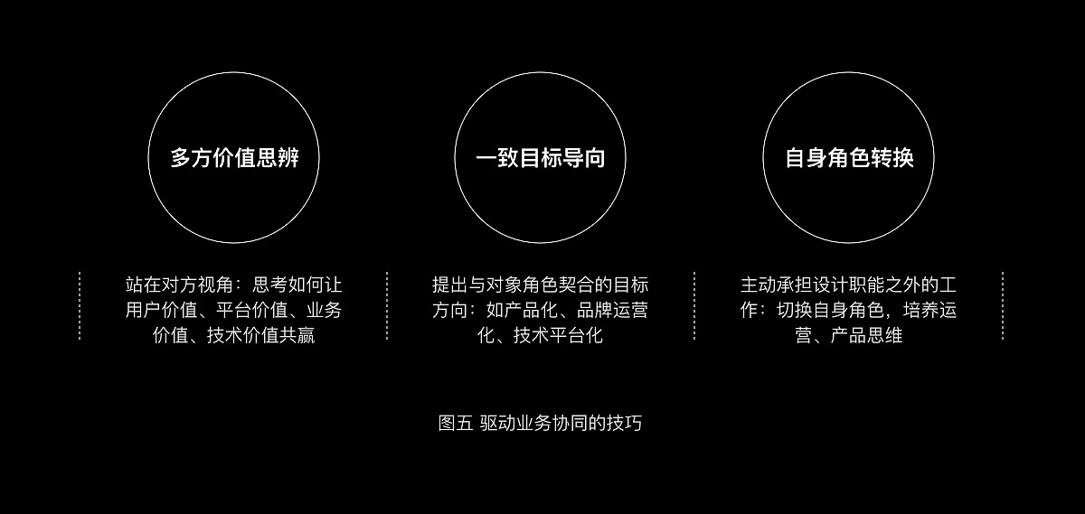 多方价值思辨: 为了更好地撬动业务资源,你需要主动去游说各方。除了提供一份独创性、有价值的设计方案之外,还需要深入思考对方需要什么。你需要对各个职能的工作内容有一个明晰的了解,需要站在对方视角将各方价值论证清楚,思考用户、平台、业务、技术价值分别是什么,你能给对方带来什么,“思其所想、破其所难”的方式更容易打动对方。