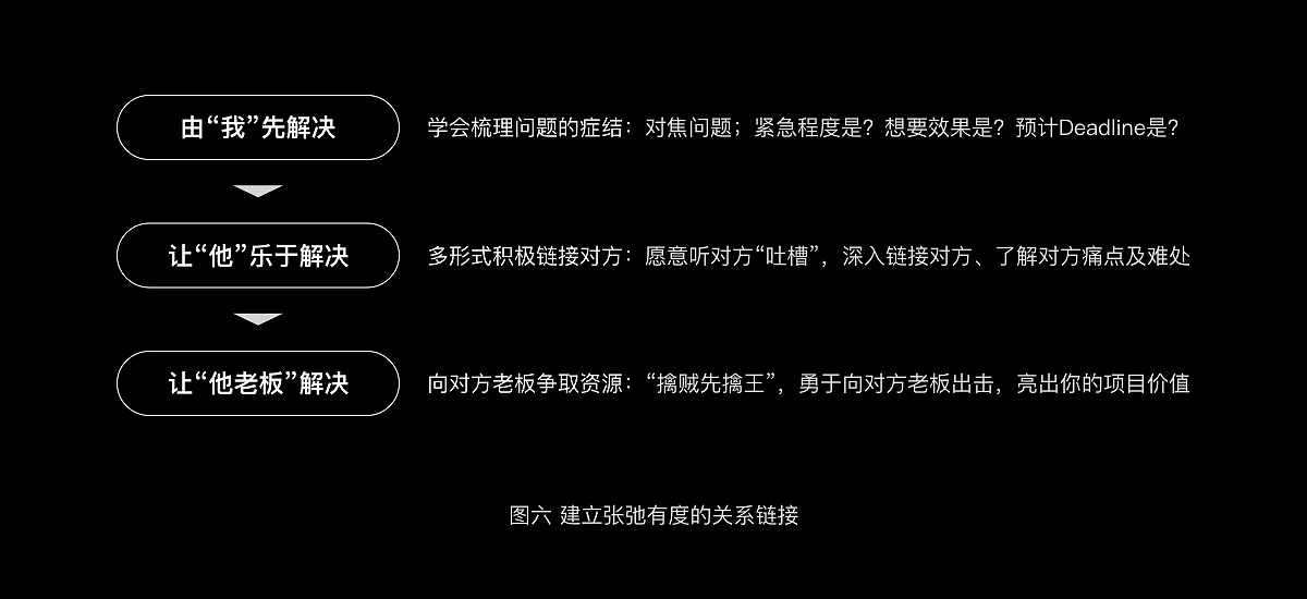 (c)在项目中也会遇到一些重大挫折,最终效果不佳影响了用户体验,对方却不能提出较佳的解决方案、甚至会影响产品上线,却碍于对方资源问题无法进行优化。这时候你要勇于找到对方老板,俗话说“擒贼先擒王”,勇于向对方老板说出你对项目的要求,甚至可以带着一份详细的项目规划及价值给到对方老板,搞定对方老板,也就搞定了你需要的项目资源。