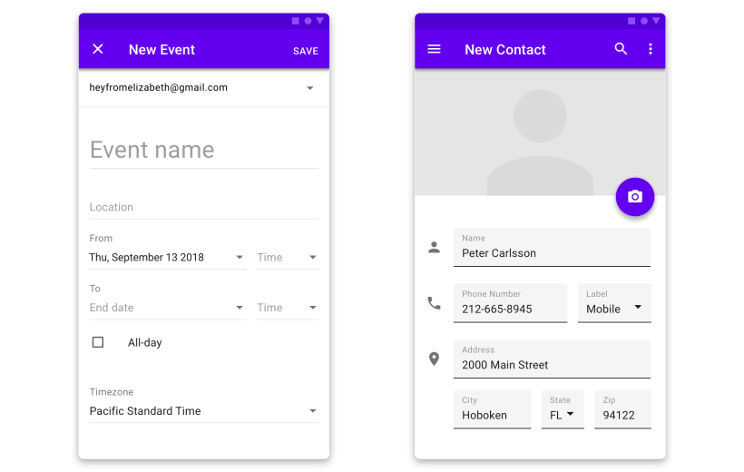 如果在开始和结束元素之间有一个很清晰的空间和层级关系,共享动画就可以强化这种关系。例如,在导航步骤上,开始和结束组件共享一个垂直滑动动画,这种方式加强了在垂直方向上的信息内容。当按下步骤中的下一个按钮时,组件元素之间共享了一个水平滑动动画,从左向右的滑动强化了步骤进行的概念。共享动画也是运用了谷歌 Material动画的标准缓动。