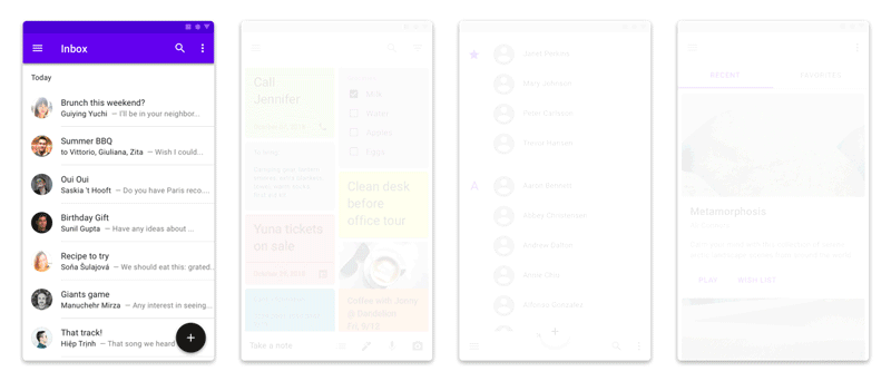 如果容器是从屏幕边界进入,则它会淡入并放大。 动画不是从0%的比例开始出现,而是从95%开始,以避免过度弹跳。 缩放动画使用 Material动画的减速规范,这意味着它以最大速度开始并轻轻地减速并停止。 当元素要退出时,容器会在没有缩放的情况下淡出, 退出动画设计会比进入时更微妙,以便让用户将注意力集中在新内容上。