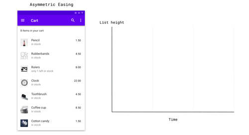Easing(缓动)描述了动画的加速和减速速率,大多数导航的切换使用 Material动画的标准缓动,这是一种非对称类型的缓动形式。这意味着元素在开始阶段以很大的加速度进行加速运动,然后再以很小的加速度去减速,目的是将用户注意力集中在过渡结束的位置。这种类型的缓动使得动画看起来非常自然,因为现实世界中的物体是不会立即开始或者停止运动的。如果过渡看起来很僵硬、不自然,很可能是因为错误的选择了对称性或者线性速率。
