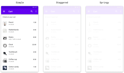 有些容器只是使用 Material动画的标准缓动从屏幕外滑入, 它滑动的方向取决于与之关联的组件的位置。 例如,点击左上角的抽屉导航图标,菜单将从左侧滑入容器。
